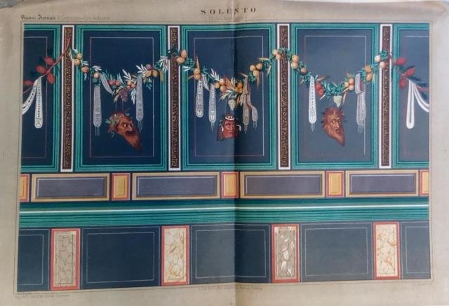 Estratto da "Nuovi Annali di Costruzioni, Arti ed Industrie". Cm.38,4x27,5. Pg.8. Assai evidenti tracce d'uso: causa le dimensioni, i margini esterni hanno subito vistiose piegature, con relativi strappetti, ma il testo, su due colone, è integro. Tre tavole a doppia pagina raffiguranti la "Pianta delle rovine di Solunto", dettagli di capitelli e di pavimento a mosaico e particolare policromo di pittura di una parete. Dedica manoscritta dell'autore. Studio sulla antica città siciliana di origine fenicia. Codice libreria 155162.