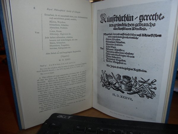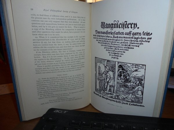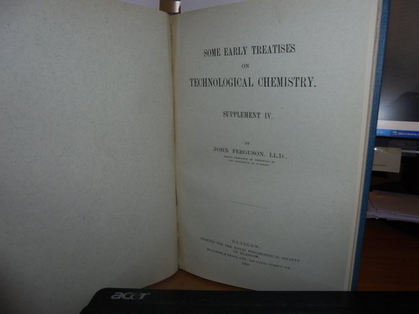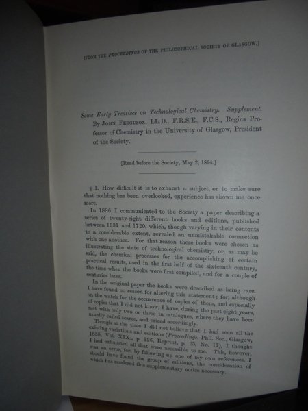 Ferguson, John. Robert Anderson, Glasgow, 1888/1916. Some Early Treatises on Technological Chemistry. In-8° piccolo, tela con titolo in oro entro tassello al dorso. 34, 12, 12, 29, 43, 55 pp. con tavole fuori testo. Raccolta completa molto rara. Alexander. Bibliogr. of J. Ferguson, 56 - 61. " A very interesting little tracts which contains much of importance in the history of the Kunstbuchlein and other works which were frequently reprinted on the subject of mining, metallurgy and chemistry. As usual the author gives particularly complete details of the various editions through which the works went" (Duveen). Perfetto esemplare in legatura recente con tutte le copertine originali conservate. Neg. Bol. mob. S