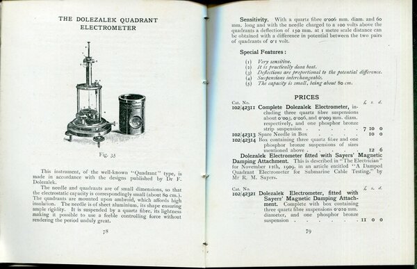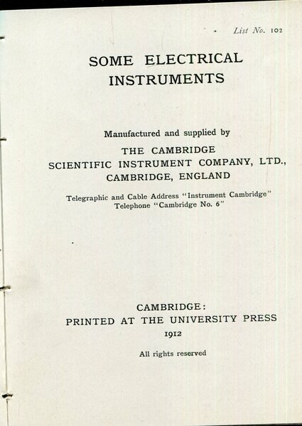 Cambridge Scientific Instrument Company, LTD Some electrical instruments : list no. 102. Cambridge, University Press 1912, In 16, 117 pages, softcover, illustrated. stamp saying: all prices in this list cancelled, january 1919" at page 7, very rare Ottimo (Fine) . <br> <br> <br>