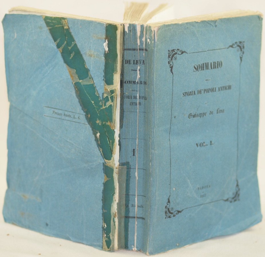 In 8. Dim. 23,5x15 cm. Pp. 566. Interessante opera del 1856 sulla storia dei popoli antichi scritto da Giuseppe de Leva. Sebbene in copertina sia presente l'indicazione "vol. I", l'opera è in un volume ed è completa. All'interno: gli egiziani (geografia, Valle del Nilo, storia, cultura), i semiti (antico Impero babilonese, cultura, industria e commercio, fenici, Assiri) Indiani, Battriani medi e persiani, Greci, Macedoni, romani ecc. In discrete condizioni. Copertina editoriale in mediocri condizioni generali con usure ai margini e dorso. Piatto posteriore staccato e segni di nastro adesivo. Legatura in discrete condizioni con rotture. All'interno le pagine si presentano in ottime condizioni con fioriture. Interesting work of 1856 about the history of ancient people written by Giuseppe de Leva. Even if in the cover there is the indication "vol. I", the work is in one volume and it is complete. Inside: egyptians (geography, Nile Valley, history, culture), jewish (Ancient Babilonian Empire, culture, industry and trade, phoenix, Assiri) Indians, Battriani medians and persians, Greeks, Macedoni, romans ecc. In fair conditions. Editorial cover in poor general conditions with wearings in the edges and spine. Back plate is detached and signs of adhesive tape. Binding in fair conditions with cracks. Inside pages are in very good conditions with foxings.