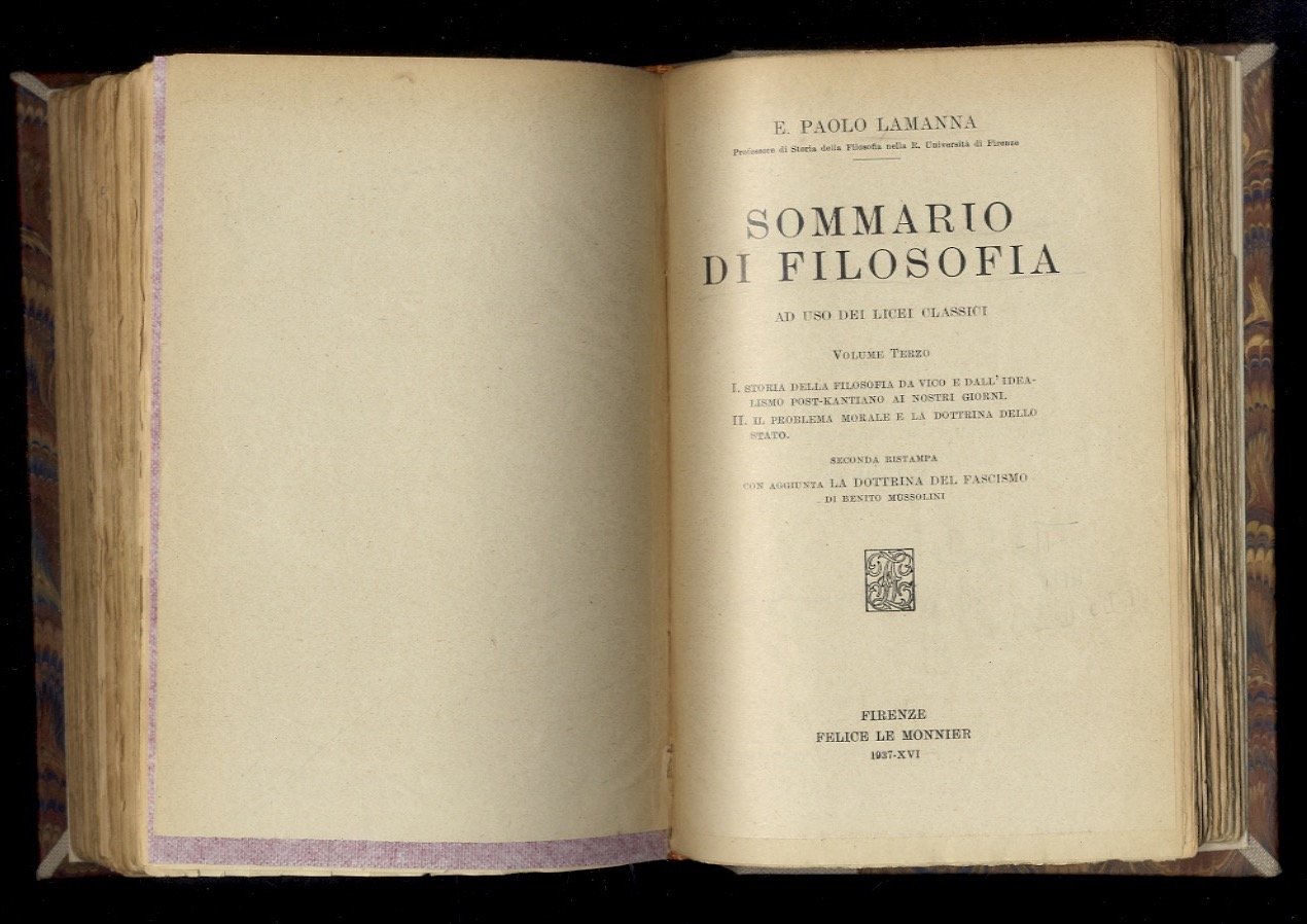 Sommario di Filosofia ad uso dei licei classici. Volume I. Storia della filosofia nell'Antichità e nel Medio Evo [- Volume II: Storia della filosofia dal Rinascimento a Kant - Volume III: Storia della filosofia da Vico e dall'idealismo post-kantiano ai nostri giorni. Seconda ristampa con aggiunta La dottrina del fascismo di Benito Mussolini].