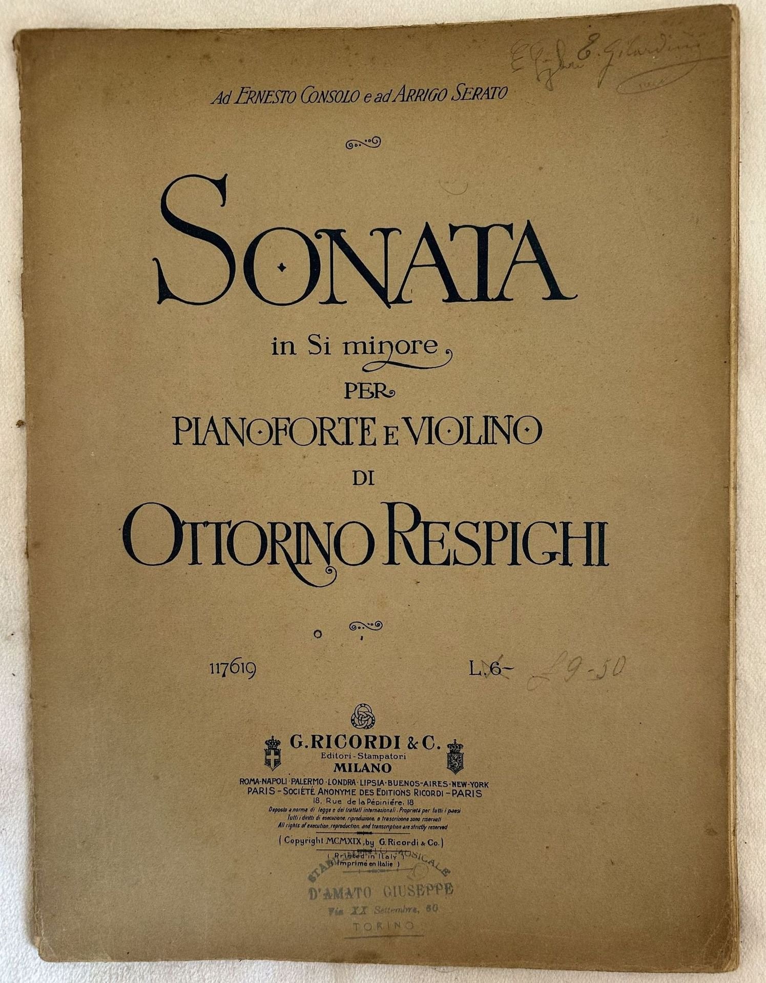 Edizione del 1919 della melodia "Sonata in Si Minore" del compositore Ottorino Respighi (1879-1936) per pianoforte e violino.In discrete condizioni.Copertina editoriale in discrete condizioni con lievi usure marginali. Legatura in buone condizioni. Pagine in buone condizioni con rare fioriture. In folio. cm. 34,5x26. Pp. 33+10.Edition of 1919 of the melody "Sonata in Si Minore" by the composer Ottorino Respighi (1879-1936) for the piano and violin. In fair conditions. Editorial cover in fair conditions lightly worn with tears in the extremities. Binding in good conditions. Pages in good conditions with occasional foxing. In folio. cm. 34,5x26. Pp. 33+10.