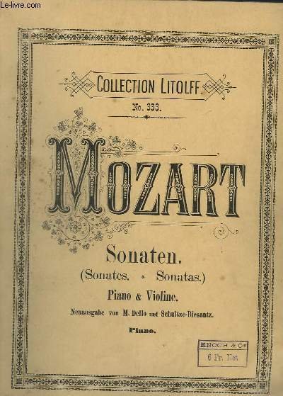 NON DATE. In-4. Broché. Etat d'usage, Tâchée, Dos abîmé, Quelques rousseurs. 259 pages de partitions pour piano + 92 pages de partitions pour violon. Volume pour piano : Frontispice du portrait de Wolfgang Amadeus Mozart en noir et blanc. Tampon de l'éditeur sur le premier plat. Volume pour violon : Protection plastique transparente. Inscriptions discrètes sur le haut du premier plat. . . . Classification Dewey : 780.26-Partitions