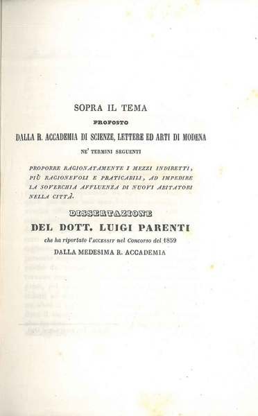 Sopra il tema proposto dalla R. Accademia di scienze, lettere ed arti di Modena ne' termini seguenti: proporre ragionatamente i mezzi indiretti, più ragionevoli e praticabili, ad impredire la soverchia affluenza di nuovi abitatori nella città