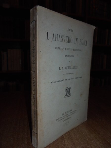 Sopra L' Ahasvero in Roma. Poema di Roberto Hamerling considerazioni di L. A. Michelangeli con un' appendice sulle traduzioni italiane dello stesso poema. In Bologna, presso Nicola Zanichelli, 1878. In-16°, br. orig. 268 pp. Molto ben conservato. Esemplare a fogli chiusi. Neg. mob. 7