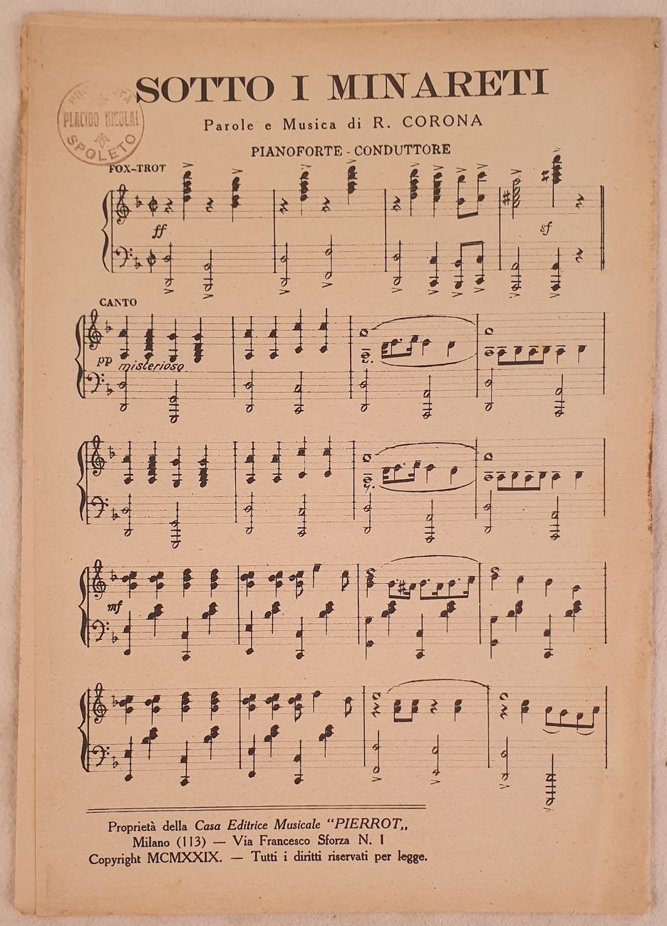 Bello spartito, partitura completa per orchestra del 1929 di una canzone di Romolo Corona.<BR>Copertina mancante. Ex libris in qualche pagina GENERE: Fox trot STRUMENTI: pianoforte violini violoncello clarinetto flauto tromba contrabasso batteria ANNO: 1929 NOTE: In 8. cm 25,5x18. pp. 10. Ottime condizioni Beautiful score of one song a complete score for orchestra of 1929 by Romolo Corona. Cover is missing. Ex libris in tsome pages MUSIC: Fox trot INSTRUMENTS: piano violins violoncello clarinet flute trumpet contrabbass drums YEAR: 1929NOTES: In 8. cm 25,5x18. pp. 10. In very good conditions.
