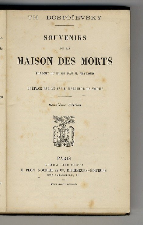 Souvenirs de la Maison des Morts. Traduit du russe par M. Neyroud. Préface par le V.te E. Melchior de Vogüé. 2ème édition.