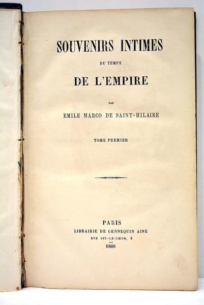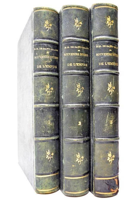 in-4. 3 volumes. 638 pages. 1 feuillet. 20 planches hors-texte. + 662 pages. 1 feuillet. 16 planches hors-texte + 655 pages. 12 planches hors-texte (sur 16). (24,5x15,5cm). Demi-basane verte de l'époque. Dos à nerfs avec titre et décors gravés à froid. Défauts d'usage aux reliures. Frontispice détaché (tome 1). Papier un peu bruni. Bon état. Marco Saint-Hilaire fut un véritable polygraphe qui, après 1830, s'attacha à composer des ouvrages ayant pour but de glorifier l'Empire. Il prétendait leur donner un cachet d'authenticité en y évoquant ses souvenirs de page à la cour impériale.