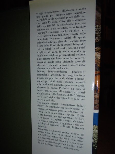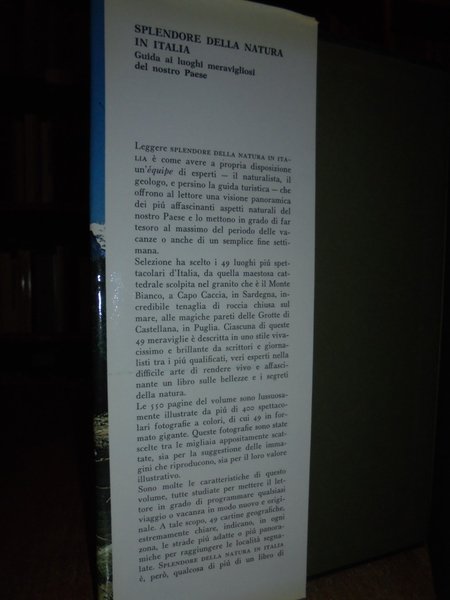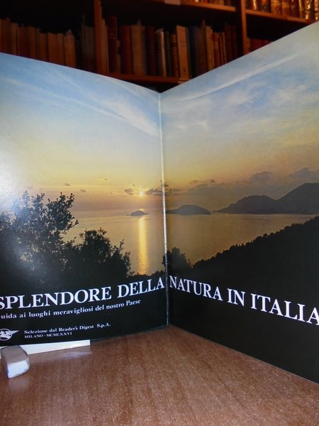 Autori vari. Milano, Selezione dal Reader' Digest, 1976. Splendore della natura in Italia. Guida ai luoghi meravigliosi del nostro Paese. Prima edizione. In-8° grande similpelle con titoli in oro sul piano e al dorso e sovracopertina. 548, (1) pp. con innumerevoli illustrazioni a colori anche a piena pagina. Libro come nuovo. Neg. nat.