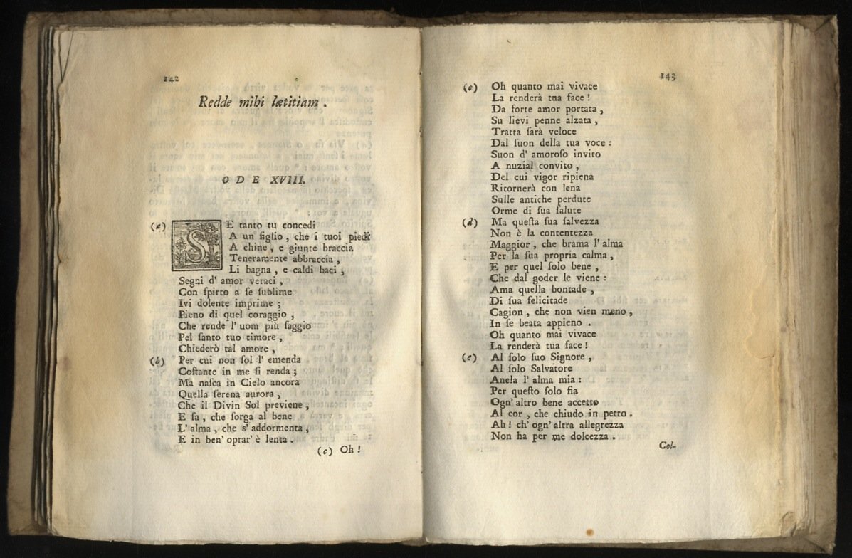 Roma & Firenze, Moücke, 1758, in-8, cartone coevo. Alcune iniziali incise in legno. Frontespizio stampato in rosso e nero. Ingialliture nel margine di parte delle pagine.