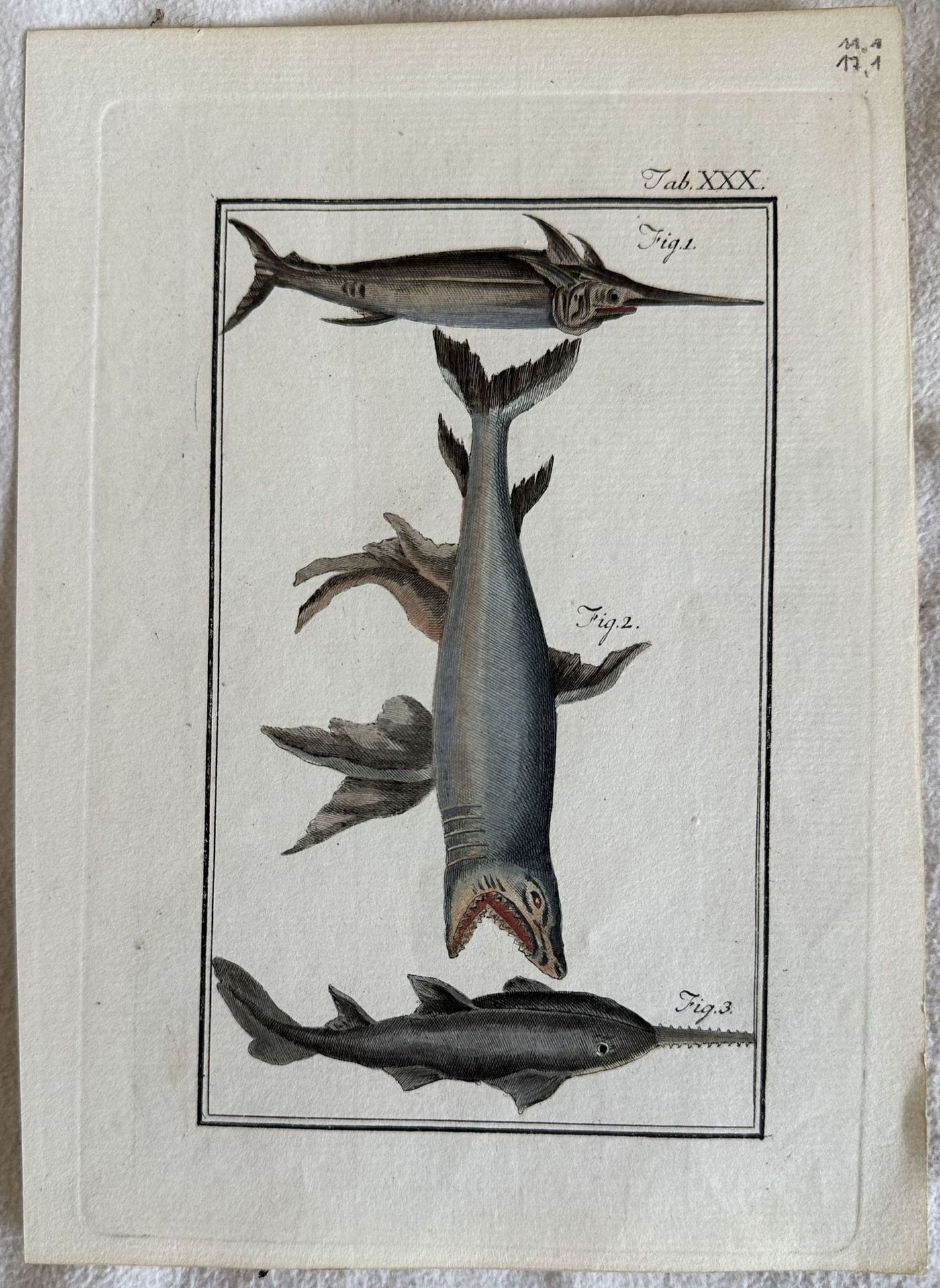 Bella incisione colorata a mano della seconda metà del settecento tratta dalla monumentale opera di storia naturale di Buffon, carta vergata.<BR>L'incisione rappresenta unoescespada, squalo e pescesega.<BR>In buone condizioni, fioriture. TECNICA: acquaforte DIMENSIONI FOGLIO: cm 22x14 DIMENSIONI INCISIONE: cm 20,5x14,5 EPOCA: seconda metà '700 Buffon fu un'esponente del movimento scientifico legato all'illuminismo e le sue teorie influenzarono le generazioni successive di naturalisti in particolare Jean Baptiste Lamarck e Charles Darwin.<BR>Questa è la sua opera più celebre ed è l'"Histoire Naturelle" pubblicata per la prima volta tra il 1749 ed il 1789 in 36 volumi di cui 8 postumi grazie al lavoro di Bernard Lacepede. Buffon espone tutto il sapere dell'epoca nel campo delle scienze naturali e proprio in questo scritto rilevò le somiglianze tra l'uomo e la scimmia e la possibilità di una genealogia comune.Nice engraving coloured by habd of second half of 18th century taken from the monumental work of natural history by Buffon, wide paper.<BR>The engraving represents one species of shark, swordfish and sawfish In good conditions, foxing. Date: second half of 18th century Technique: etching Size of the page:cm 22x14 Size of the engraving: cm 20,5x14,5 Conditions: Good conditions. Some foxing Buffon was an exponent of the scientific movement connected to illuminism and his theories inspired the next generations of naturalists in particular Jean Baptiste Lamarck and Charles Darwin. His most famous work is l'"Histoire Naturelle" published for the first time between 1749 and 1789 in 36 volumes of which 8 are posthumous thanks to the work of Bernard Lacepede. Buffon exposes in the work all the notions in natural history and in this writing in particular underlined the similarity between monkeys and man with a possibility of common genealogy.