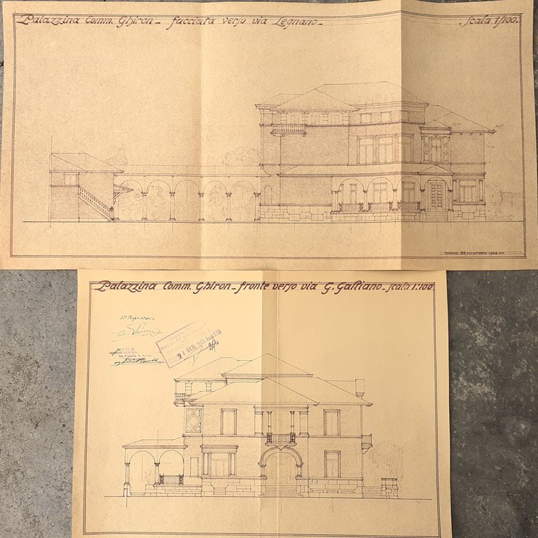 Stampa di due disegni del progetto architettonico della Palazzina Comm. Ghiron Torino 1985
