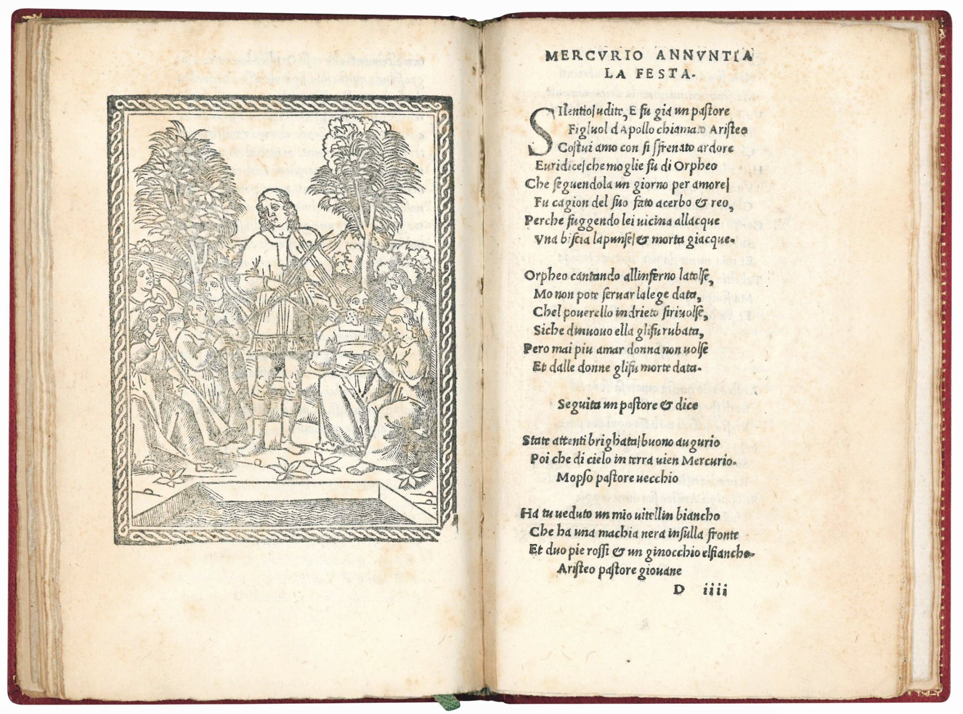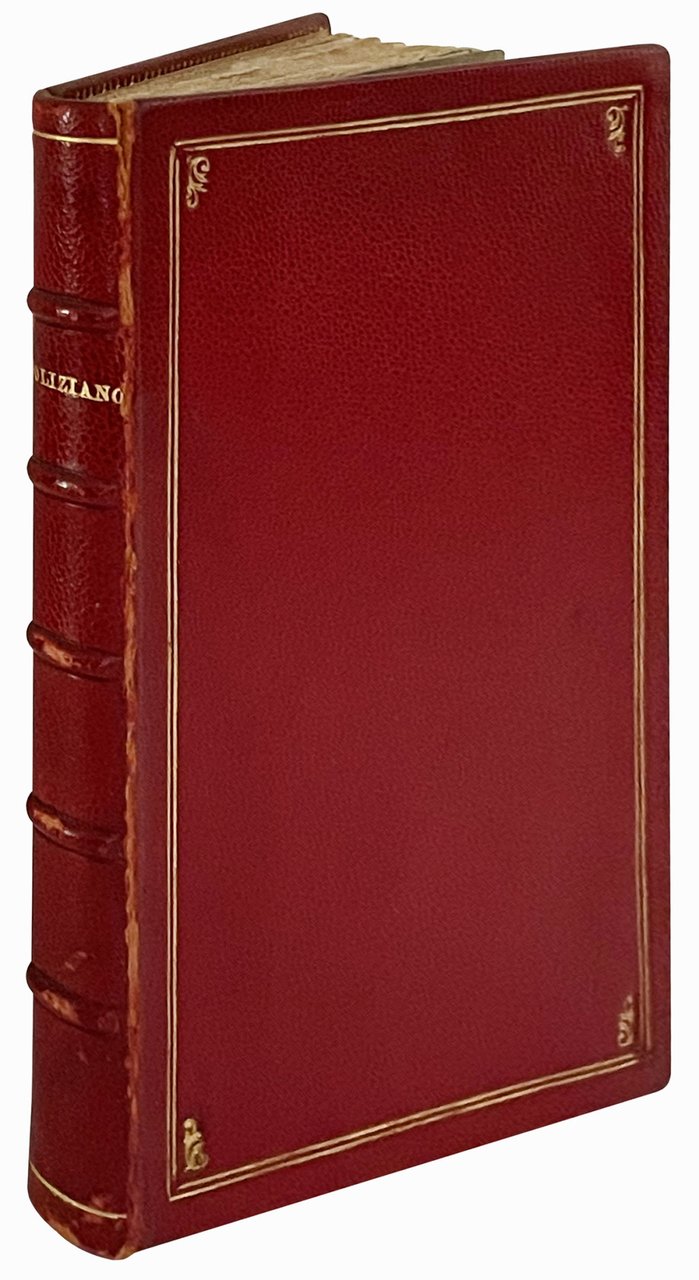 8vo (152x99 mm). [39 of 40] leaves. Collation: A-E8. Lacking E8, a blank. Title within a woodcut ornamental border. Printer's device and colophon on l. E7v. The Fabula di Orpheo begins on l. D4r and is preceded by a full-page woodcut illustration of Apollo playing the violin among the Muses. At the end are a letter by Alessandro Sarti to Antonio Galeazzo Bentivoglio and an Epitaphium Angeli Policiani per Iacobum Philippum pellibus nigris Troianum. 20th-century red morocco gilt (joints and spine worn). Upper margin of the title-page border slightly trimmed, gutter of the title page reinforced, some light foxing and browning. Overall a good copy bearing some contemporary reading signs and a manuscript note on l. C2r.