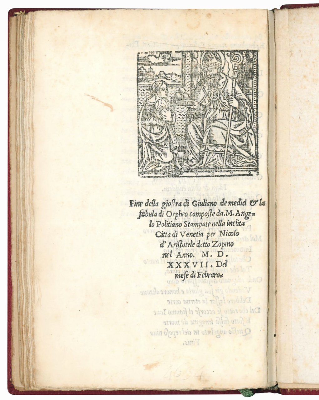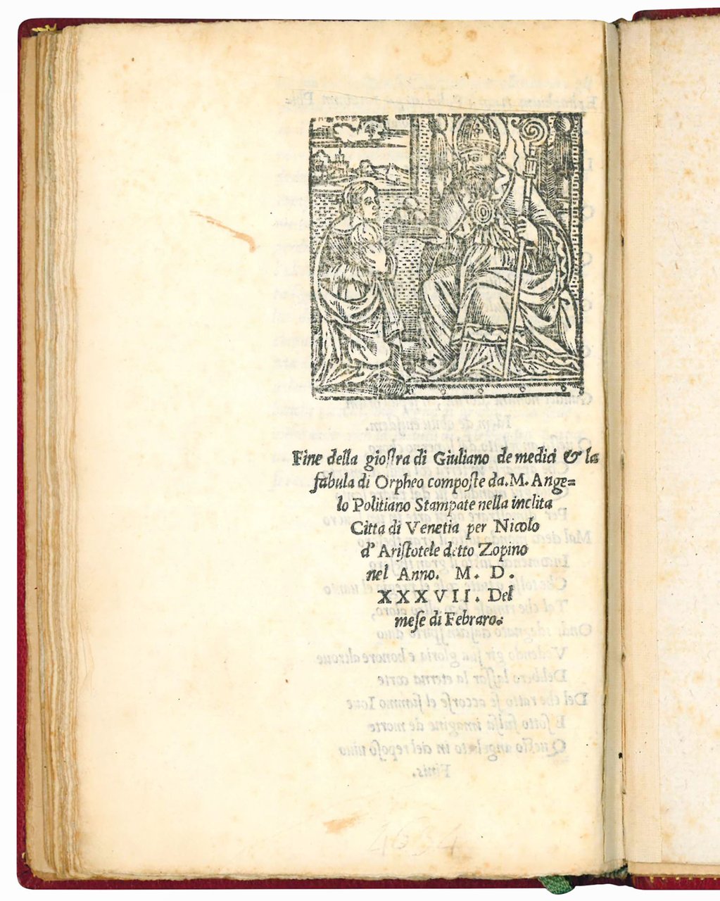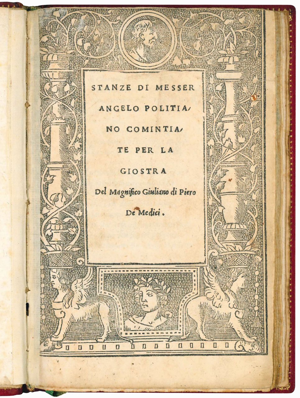 Stanze di Messer Angelo Politiano comintiate per la Giostra del Magnifico Giuliano di Piero de Medici. Colophon: Stampate nella inclita Città di Venetia per Nicolo d'Aristotele detto Zopino nel Anno M.D.XXXVII. del mese di Febraro