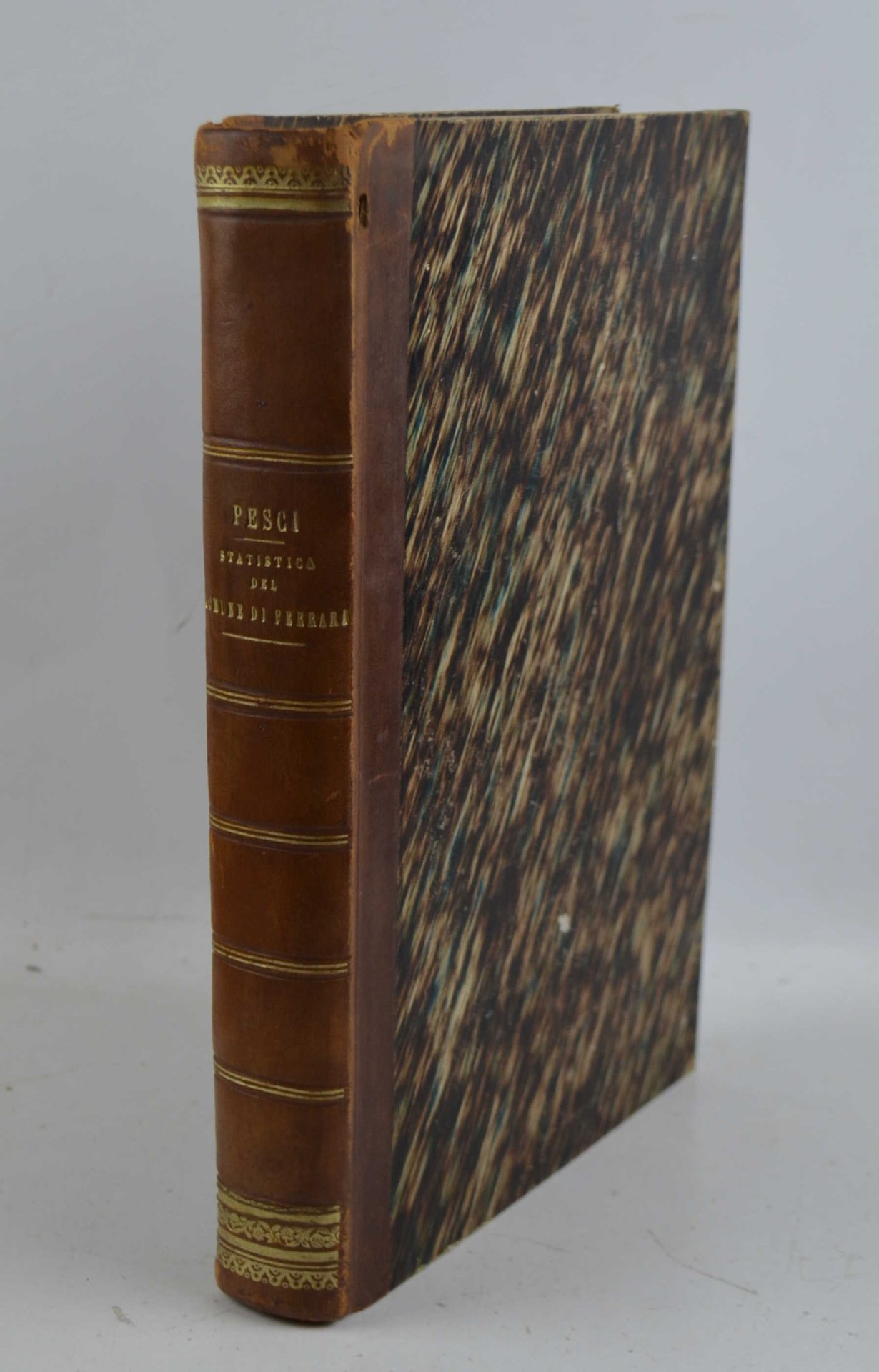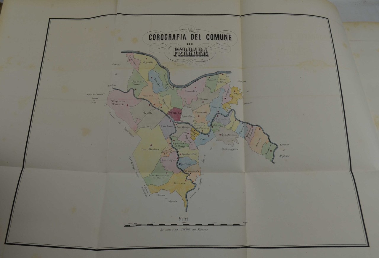 Cm. 30, pp. (4) 271 (1) + CLXXII. Con una carta corografica a colori del comune di Ferrara più volte ripieg. f.t. Solida ed elegante legatura coeva in mezza pelle, dorso liscio con titoli, fregi e filetti in oro. Esemplare genuino e ben conservato. Si tratta di una tiratura in carta grande e stampato su carta di qualità superiore alla tiratura comune che si differenzia inoltre per la coloritura della carta toporafica.