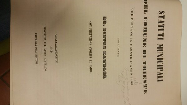 Statuti municipali del Comune di Trieste che portano in fronte l'anno 1150 editi a cura del dr. Pietro Kandler con prefazione storica ed indici