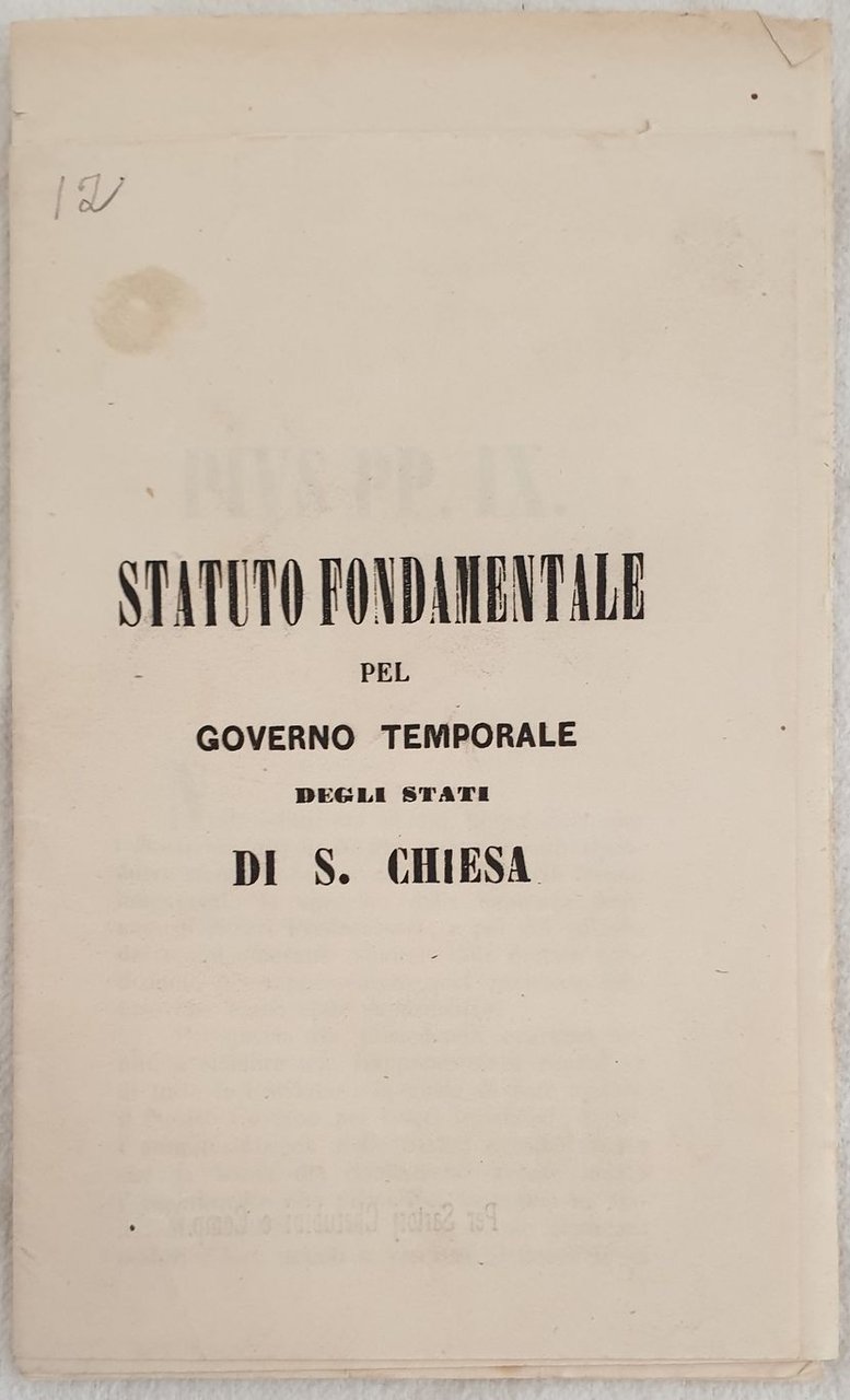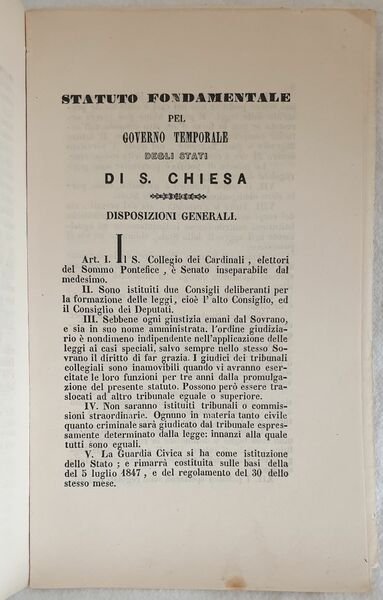 Interessante pubblicazione, la costituzione concessa da Papa Pio IX ai sudditi dello Stato Pontificio il 14 marzo 1848 a seguito dei moti rivoluzionari che colpirono tutta l'Europa. Lo Statuto ebbe vita breve, cadde con la proclamazione della Repubblica romana il 9 febbraio La data 1848 si evince dall'ultima pagina 19. In ottime condizioni. Copertina assente. Legatura editorialmente assente. All'interno le pagine si presentano in ottime condizioni con rare fioriture. In 8. Dim. 19x11,5 cm. Pp. 19.Interesting pamphlet, the constitution released by the Pope Pio IX to citizens of Stato Pontificio the 14th of march 1848 after revolutionary movements which affected the whole Europe. This Statuto has a really short life, it was cancelled after the Proclamation of roman Republic the 9th of february febbraio The date is indicated in the last page 19. In very good conditions. Cover lacks. Binding editoriarly lacks. Inside pages are in very good conditions with occasional foxing. In 8. Dim. 19x11,5 cm. Pp. 19.