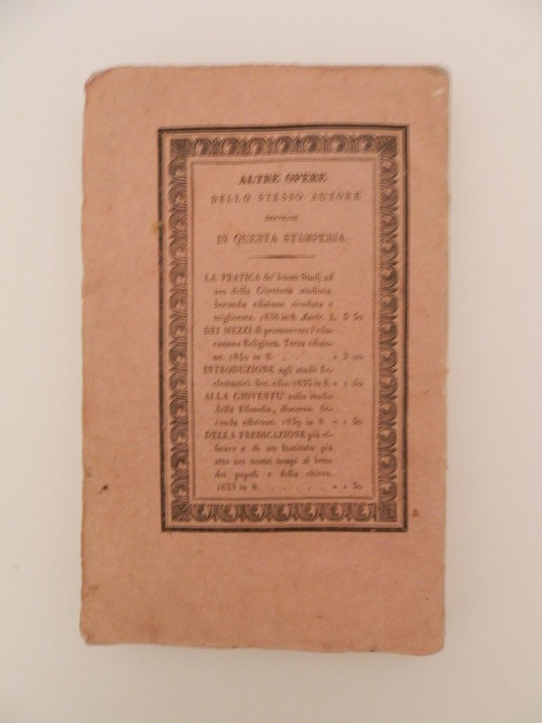 8^, pp. (4), 224, (2), brossura editoriale a stampa, timbro del Tipografo Boniardi-Pogliani di E. Besozzi, Milano, al margine inferiore del piatto. Ottimo esemplare, fresco e marginoso, con piccoli segno d'uso alla cerniera posteriore e un lievissimo alone al margine alto delle prime carte. Non comune edizione bergamasca che riporta la prefazione posta in fronte all'edizione di Loreto del 1814. Come segnala l'editore Mazzoleni: "Li tipografi di Bergamo adorrano volentieri la prefazione di Loreto, ma il lavoro della presente edizione di Bergamo è assai più esteso e completo di quello che fosse nell'edizione di Loreto".. *** TUTTI I NOSTRI LIBRI SONO VISIBILI PREVIO CONTATTO MAIL O TELEFONO NELLA NUOVA SEDE DI MILANO: LIBRERIA COSMOPOLIS, VIA JOMMELLI, 22. ***