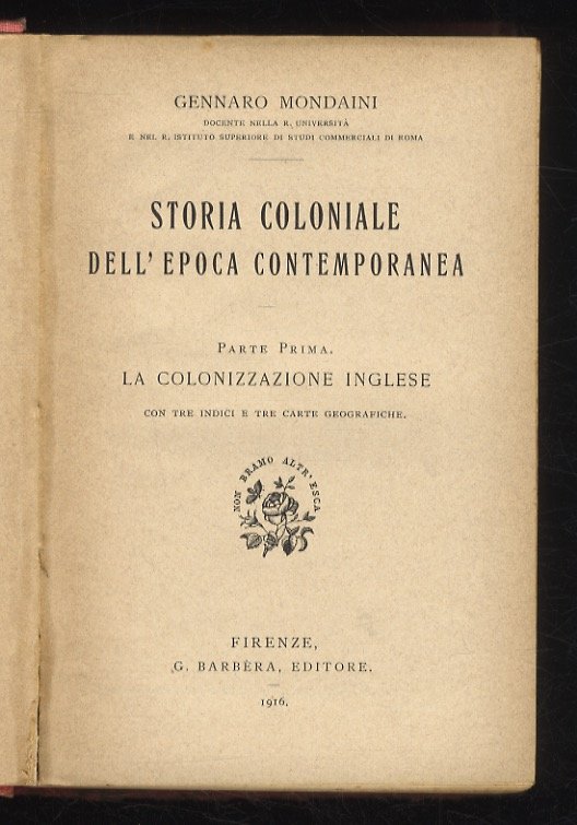 Firenze, G. Barbèra, 1916, in-16, legatura editoriale in piena tela, titolo entro cornice decorativa in nero sulla copertina anteriore, pp. LXXXIII, 809, [3]. Con 3 cartine a colori ripiegate f.t. Si tratta della sola parte pubblicata. Dorso un poco sbiadito ma buon esemplare.