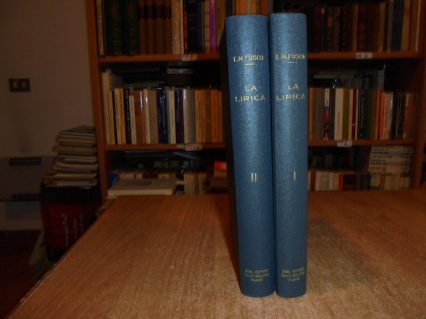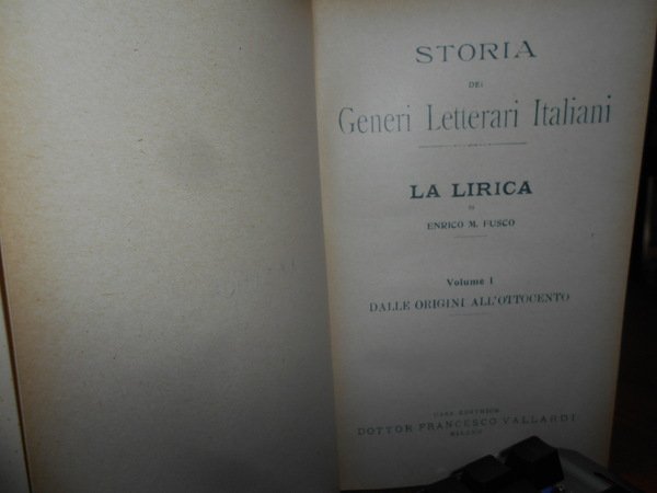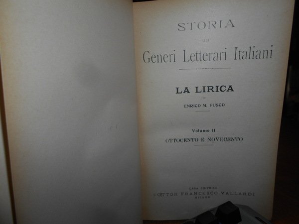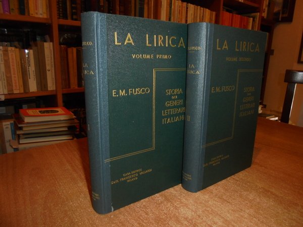 ENRICO M. FUSCO. Milano, Casa Editrice Francesco Vallardi, 1950. STORIA DEI GENERI LETTERARI ITALIANI. LA LIRICA. 2 volumi in-8°, m. tela edit. con titoli in oro sui piane e ai dorso. Vol. I. Dalle origini all' Ottocento. xi, 483 pp.; Vol. II. Ottocento e Novecento. vii, 591 pp. In ottimo stato di conservazione. Uff. A - II - 2
