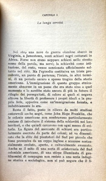 Le vicende più recenti, nella loro drammaticità e nella loro perentorietà, hanno fatto della questione negra uno dei problemi più scottanti e delicati che la classe dirigente degli Stati Uniti è chiamata a risolvere. Ma non si tratta in realtà che della fase estrema di un processo posto in movimento da oltre tre secoli, quando i primi schiavi africani vennero sbarcati sulle coste americane. Tentare di comprendere la questione razziale negli Stati Uniti significa ripercorrere sin dalle origini i suoi aspetti e i suoi momenti risolutivi, al di là del pregiudizio e della polemica occasionale. Questa Storia, per la prima volta scritta da un europeo per lettori europei, si propone una sintesi tra la ricerca condotta sulle fonti e la storiografia più accreditate e l'indagine diretta compiuta negli Stati Uniti e condotta a termine in un periodo cruciale. Essa spazia dai primordi della questione negra fino agli avvenimenti che nel 1963 hanno portato forse alle soglie di una svolta decisiva, prendendo in esame non soltanto la storia ma anche la cultura dei negri d'America.