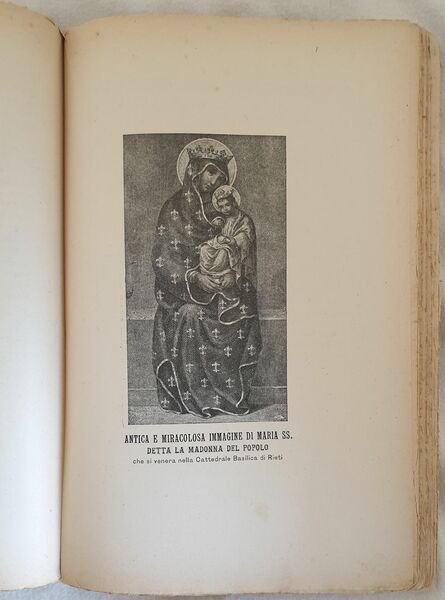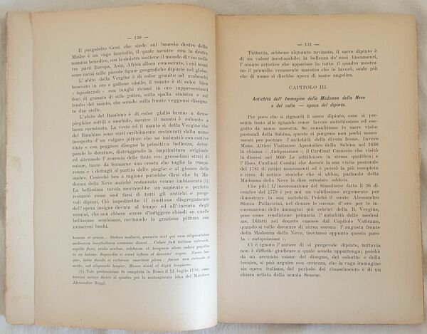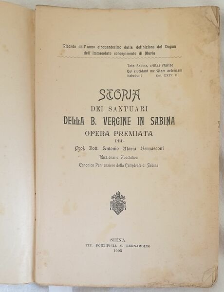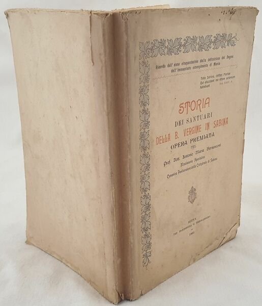 Rara opera del 1905 sui santuari della Beata Vergine in Sabina di Antonio Maria Bernasconi. I santuari descritti: Santuario della Madonna di Vescovio, Santuario della Madonna di Farfa, Santuario della Madonna di Rieti, Santuario della Madonna della neve in Palombara, Santuario della Madonna delle Grazie di Magliano, Santuario della Madonna di Uliano in Magliano, Santuario della Madonna del diluvio in Monterotondo, Santuario della Madonna delle Grazie presso Ponticelli. Alcune planches all'interno. Dedica dell'autore alla prima pagina di sguardia senza firma. In buone condizioni. Copertina editoriale in buone condizioni generali con lievi usure ai margini e dorso. Legatura in buone condizioni. All'interno le pagine si presentano in buone condizioni con fioriture. In 8. Dim. 23,5x16 cm. Pp. (5)+294. Scrace work of 1905 about the sanctuaries of the Blessed Virgin in Sabina by Antonio Maria Bernasconi. The sanctuaries described: Santuario della Madonna di Vescovio, Santuario della Madonna di Farfa, Santuario della Madonna di Rieti, Santuario della Madonna della neve in Palombara, Santuario della Madonna delle Grazie di Magliano, Santuario della Madonna di Uliano in Magliano, Santuario della Madonna del diluvio in Monterotondo, Santuario della Madonna delle Grazie presso Ponticelli. Some plates inside. Dedication of the author in the first ednpage without signature. In good conditions. Editorial cover in good conditions lightly worn in the extremities. Binding in good conditions. Inside pages are in good conditions with foxing. In 8. Dim. 23,5x16 cm. Pp. (5)+294.
