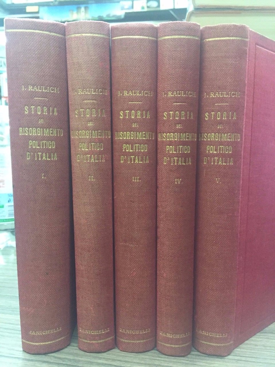 I. 1815-1830. II. 1830-1844. III. 1844-1848. IV. Marzo 1848 - Novembre 1848. V. 1849. Bologna. Zanichelli 1920, 8°, pp. XVIII+496+XV+386+XVIII+432+XIX+376+XVI+442. Leg. T.t. coeva, tit. in oro al dorso. Segni del tempo ma buon esemplare. Raro.