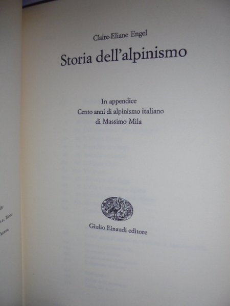 Claire-Eliane Engel. Torino, G. Einaudi, 1965. Storia dell' alpinismo. In appendice Cento anni di alpinismo italiano di Massimo Mila. In-8°, similtela edit. xiv, 394, (7) pp. con 63 illustrazioni in tavola f.t. Ben conservato ma sovracopertina non presente. Neg. Einaudi.