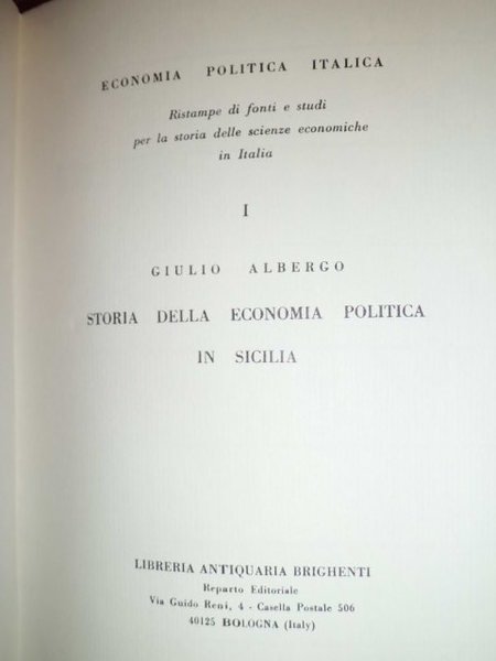 Palermo, Lorsnaider, 1885. (Bologna, Libreria Antiquaria Brighenti, 1971) IN-8°. TELA EDITORIALE. 318 PP. RISTAMPA DI SOLI 200 ESEMPLARI IN CARTA VERGATA DELLA SECONDA EDIZIONE MOLTO AMPLIATA DI QUESTA NOTEVOLE OPERA UNICA NEL SUO GENERE E TUTTORA INDISPENSABILE PER GLI STUDI STORICO-ECONOMICI MERIDIONALISTICI, DA LUNGO TEMPO IRREPERIBILE. A QUEST' ACCURATA RIEDIZIONE SONO STATI AGGIUNTI TRE INDICI CHE NE AGEVOLANO LA CONSULTAZIONE. IN STATO DI NUOVO. Neg. mass. mob. H - H