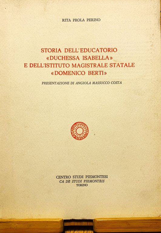 I ed. (maggio 1980). I Quaderni/ Jë Scartari, 15. VIII/ 68/ brossura in cartoncino ruvido avorio con titoli in nero e rosso. Stato buono (numero di catalogo ad inchiostro nero in quarta di copertina). Indice: Presentazione - Premessa - Storia dell'Educatorio "Duchessa Isabella" - Storia dell'Istituto Magistrale Statale "D. Berti" - Notizie biografiche su Domenico Berti - Bibliografia ed altre fonti.