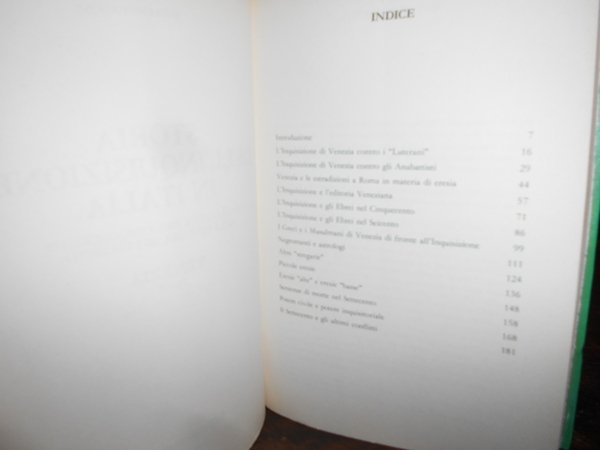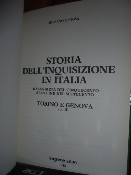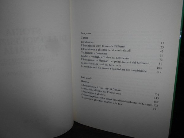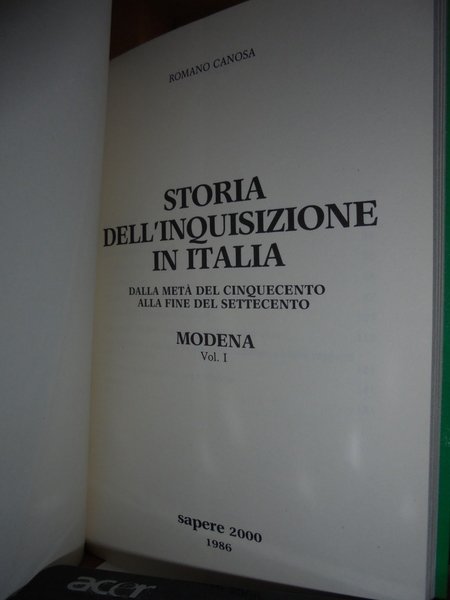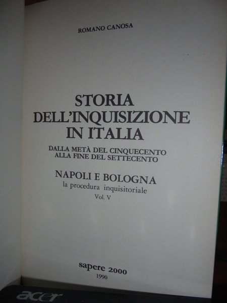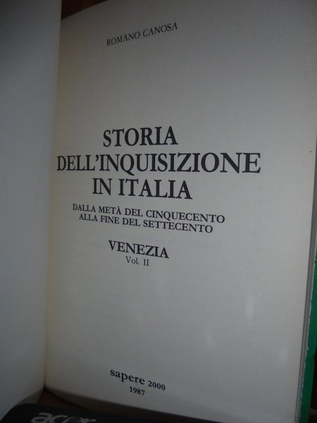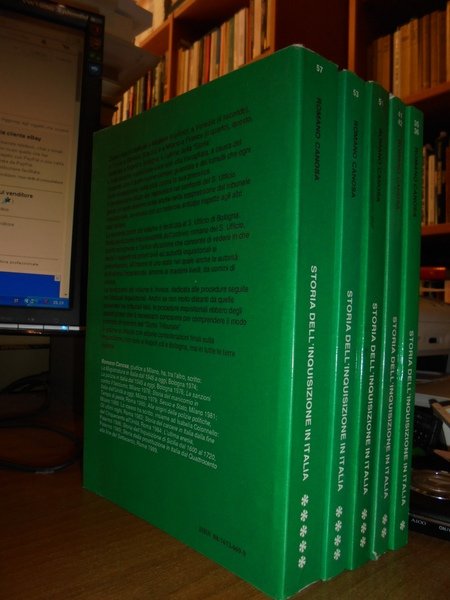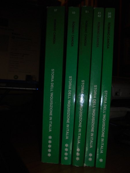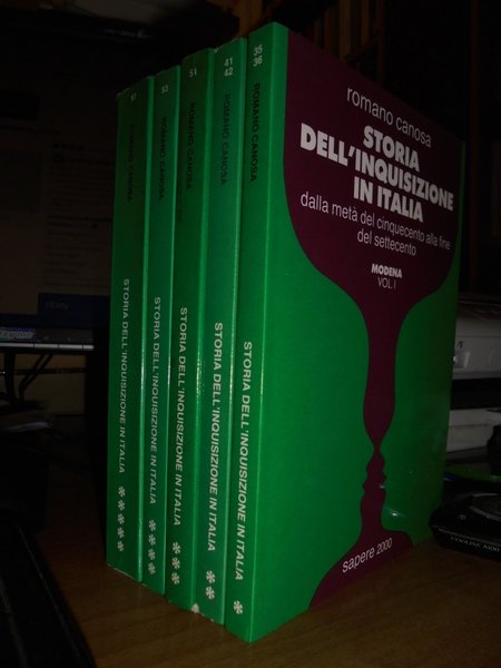 Romano, Canosa. Roma, Angelo Ruggieri, 1986. Storia dell' inquisizione in Italia dalla metà del cinquecento alla fine del settecento: Modena, Venezia, Torino e Genova, Milano e Firenze, Napoli e Bologna la procedura inquisitoriale. 5 volumi in-8°, cartoncino edit. con risvolti. 175 pp.; 192 pp.; 207 pp.; 199 pp.; 310 pp. Opera completa come nuova. Uff. TV. mob. nostro