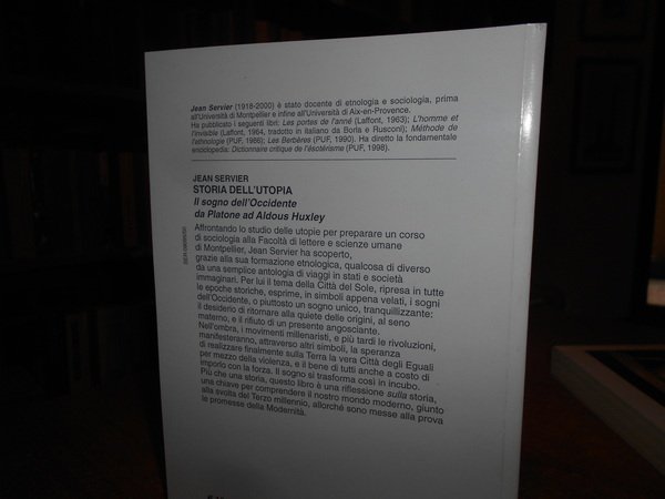 JEAN SERVIER. Roma, Edizioni Mediterranee, 2002. Storia dell' Utopia. Il sogno dell' Occidente da Platone ad Aldous Huxley. Edizione italiana a cura di Gianfranco Turris. Traduzione dal francese di Claudio De Nardi. In-8°, cart. edit. 273 pp. Come nuovo. Uff. stanzetta mob. a sinistra