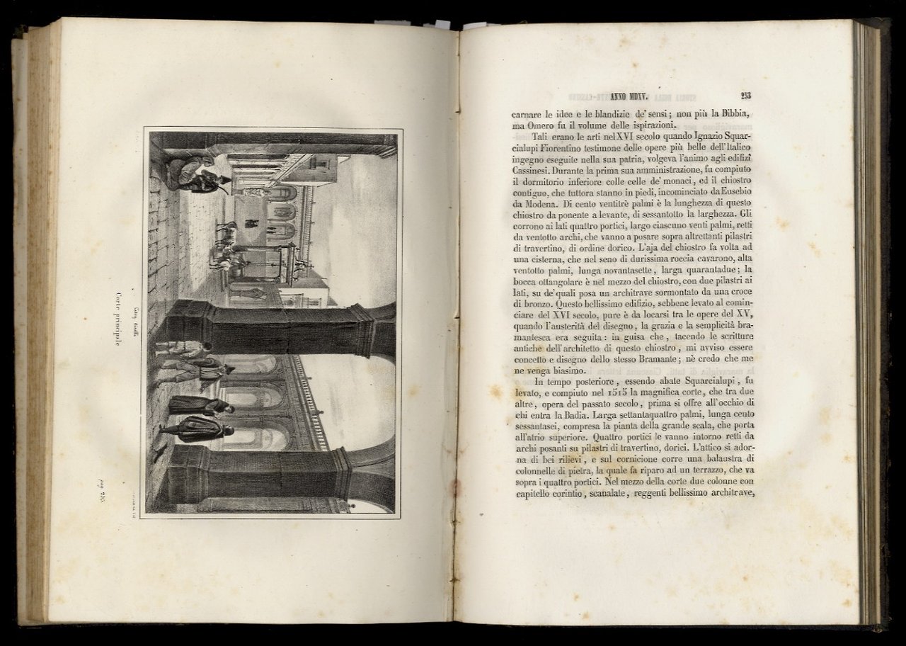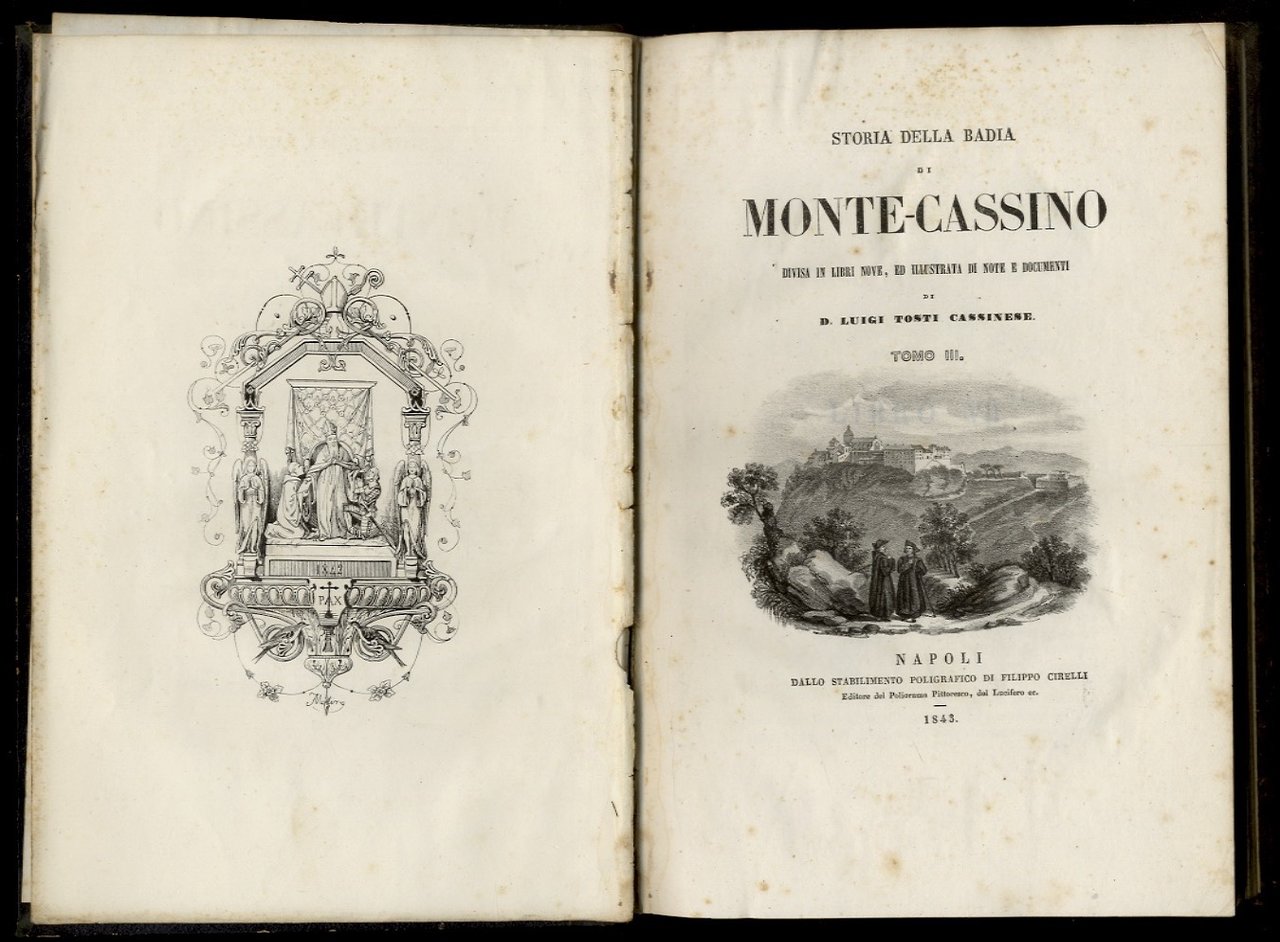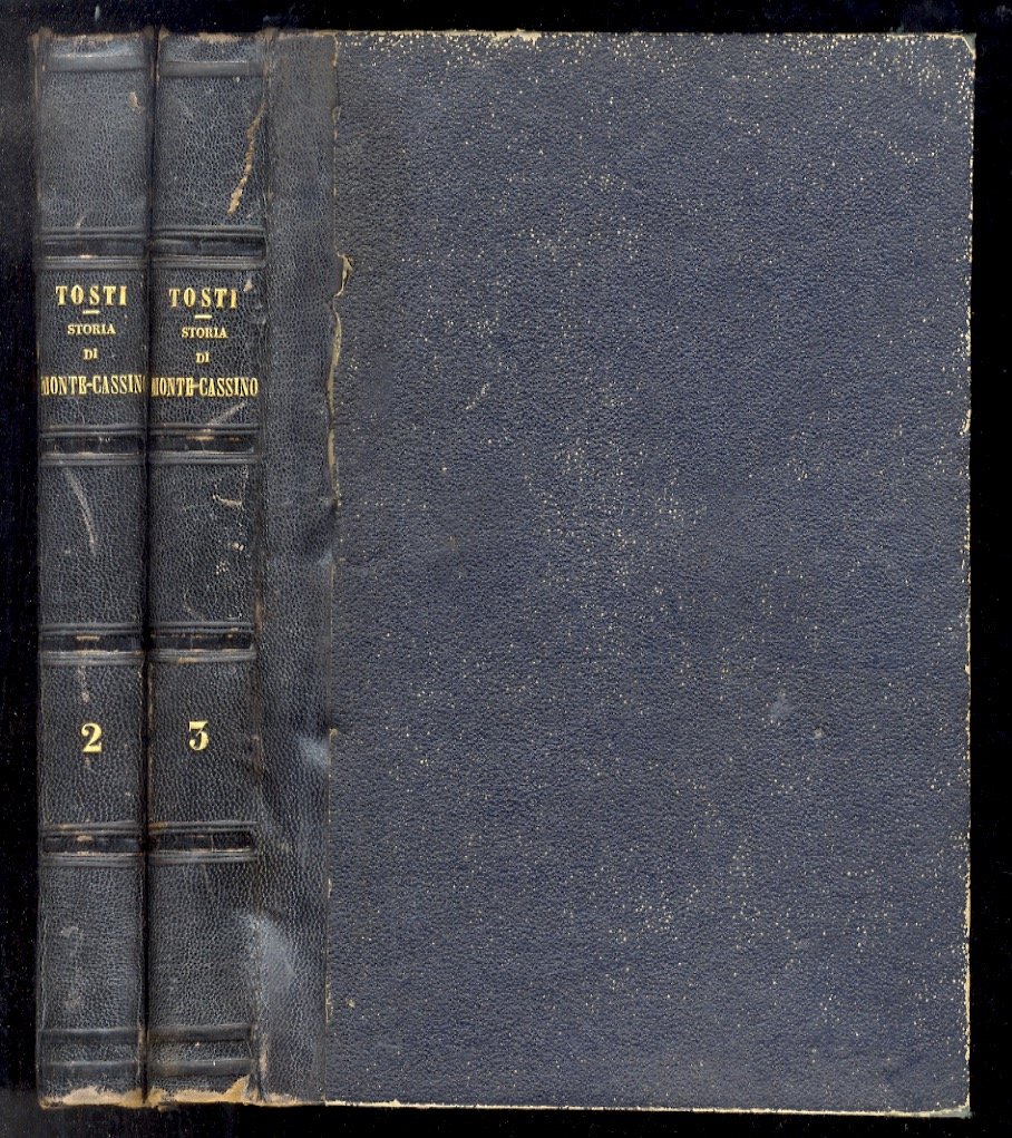 Napoli, Stab. Poligrafico di F. Cirelli, 1842 - 1843, volumi 2 (su 3), in-8, legatura coeva in mezza pelle blu, 4 nervi ai dorsi, titoli in oro, pp. 322, 384. Con antiporte, 2 diverse vedute della badia a ogni frontespizio, riproduzioni di sigilli e medaglie nel testo, 11 tavole in b.n. fuori testo, testate, finali ed iniziali, il tutto inciso in litografia da F. Molino, G. Riccio, G. Mariani, su disegno dello stesso Molino. In fine: cronologia degli abati di Monte-Cassino dall'anno 529 al 1841. Blande tracce d'uso alle coperte, alcune fioriture. Prima edizione. Manca il volume I.