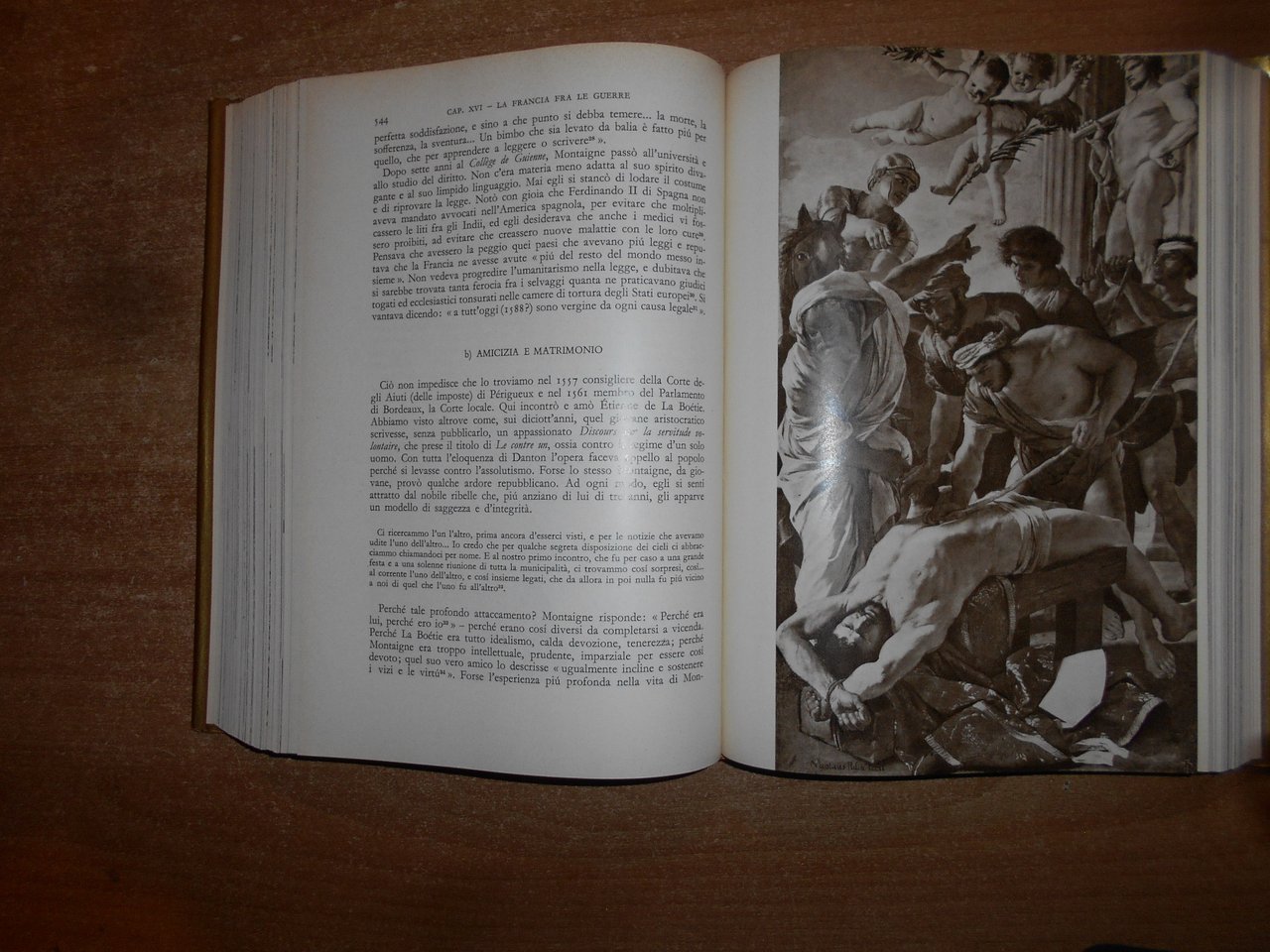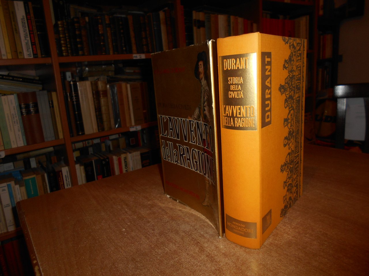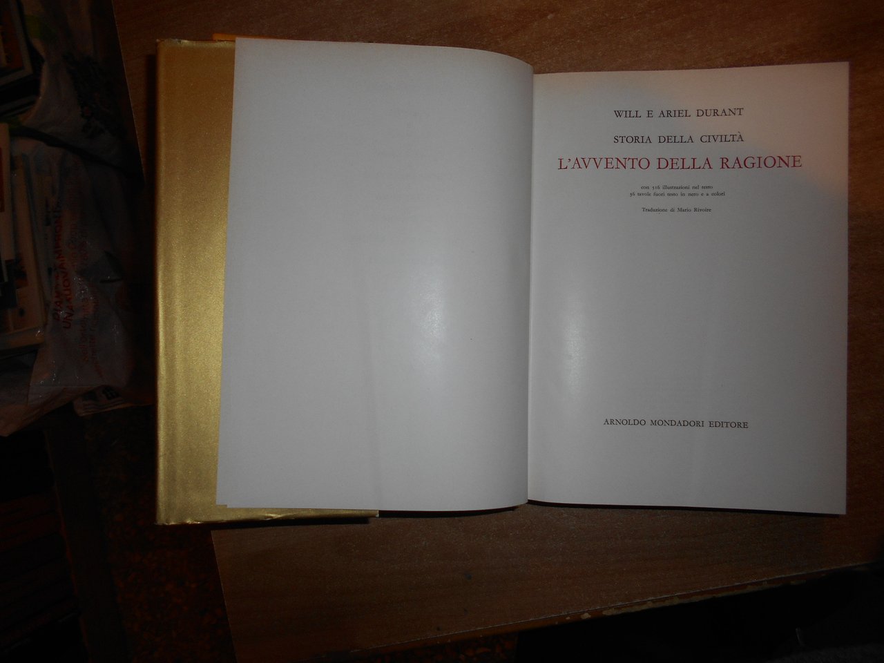Will e Ariel Durant. Milano, Arnoldo Mondadori, 1965. Storia della Civiltà. L' Avvento della Ragione. In-8°, tela edit. con sovracopertina ill. a col. 916, (2) pp. con 516 illustrazioni nel testo, 36 tavole fuori testo in nero e a colori. Traduzione di Mario Rivoire. Lievi segni del tempo nei margini della sovracopertina ma libro ottimamente conservato. Off. C - I - 6