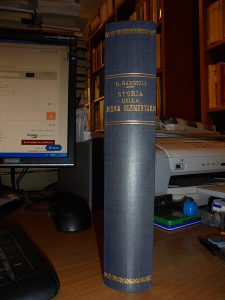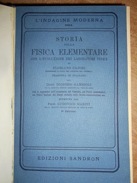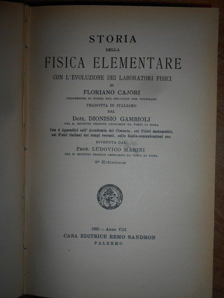Floriano, Cajori. Palermo, Casa Editrice Remo Sandron, 1930. Storia della Fisica Elementare con l' evoluzione dei laboratori fisici. Seconda edizione. In-8°, tela con fregi e titolo in oro al dorso, copertine originali conservate. 587, (6) pp. con alcune figure nel testo. Ottimo esemplare. Uff. C - II - 4