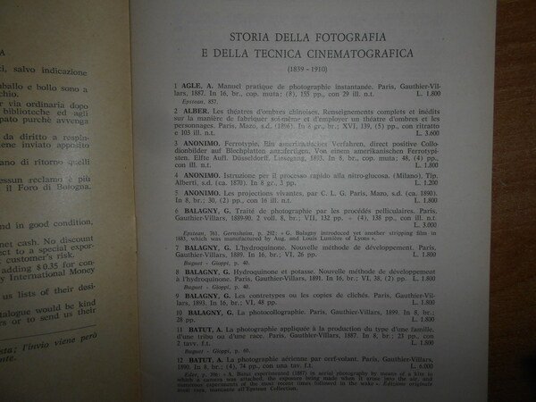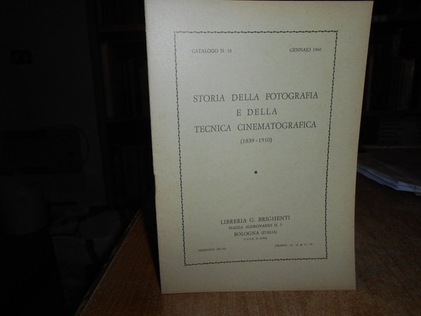 Storia della Fotografia e della Tecnica Cinematografica. Bologna, Libreria Antiquaria Brighenti, 1960. In-8° piccolo, br. con punto metallico. 24 pp. Accurata descrizione di 278 opere con prezzi il lire italiane. Raro catalogo (opuscolo) in ottimo stato di conservazione. Neg. scat. npnn. 3 opuscoli parav.