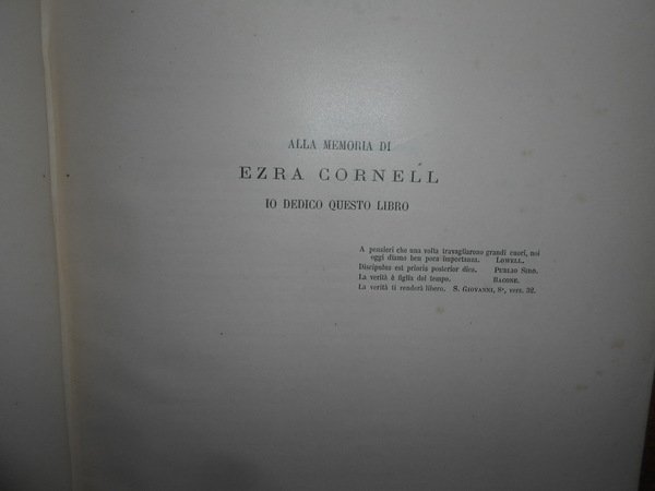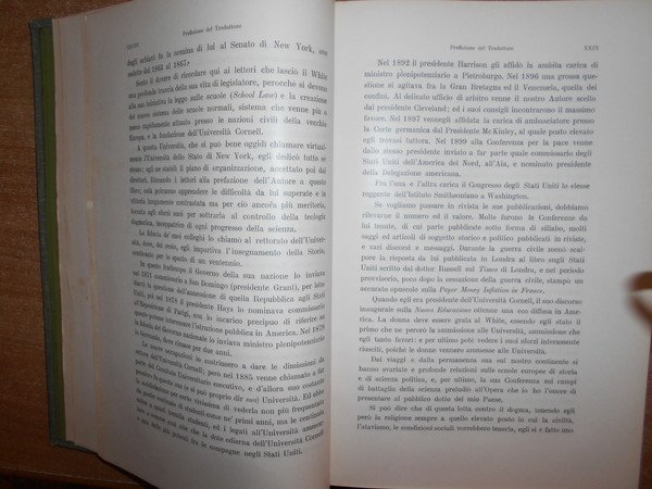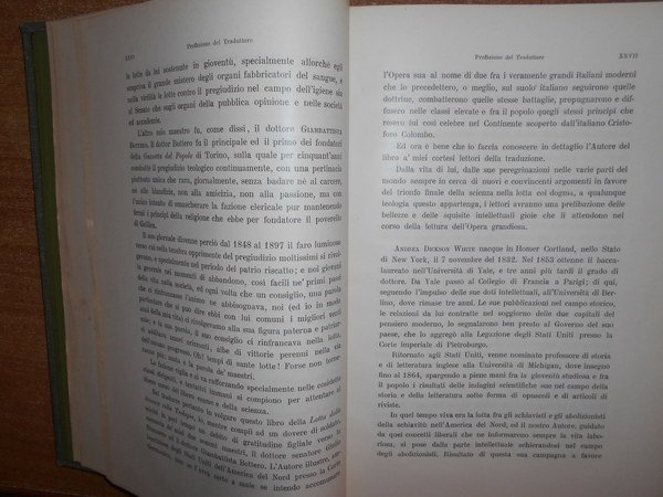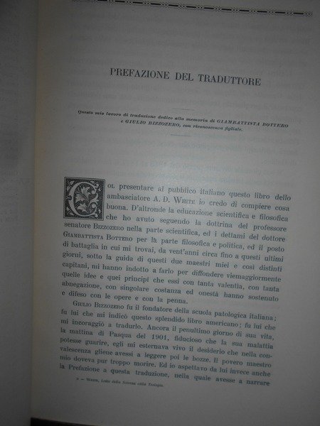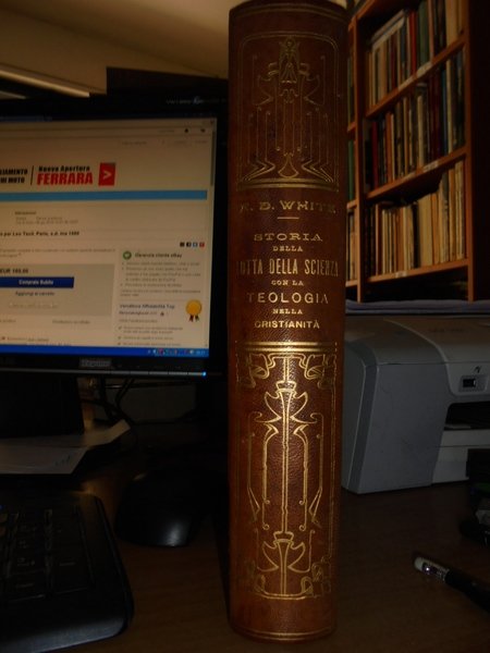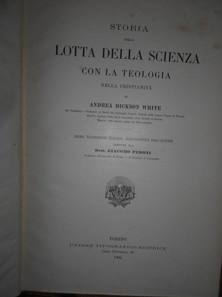Andrea, Dickson White. Torino, U.T.E.T, 1902. Storia della lotta della Scienza con la teologia nella cristianità. Prima traduzione italiana acconsentita dall' Autore compiuta dal Dott. Giacomo Peroni. In-4° bella legatura coeva in m.pelle con fregi e titolo in oro al dorso. xliii, 776, (1) pp. errata. Esemplare in ottimo stato di conservazione. Neg. sotto esot.
