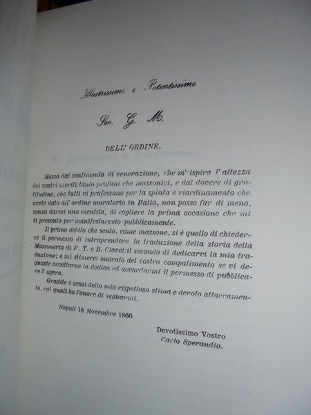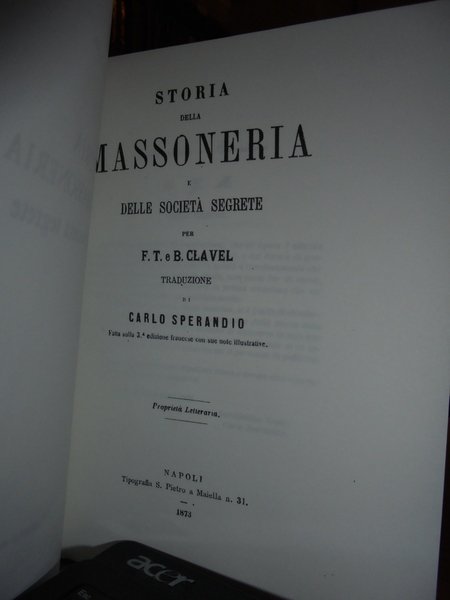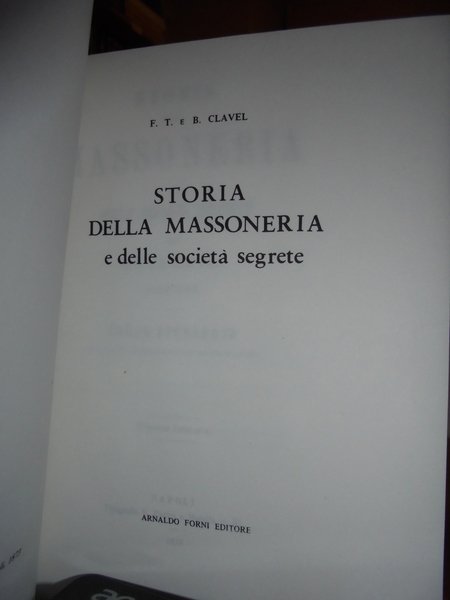 F.T. e B. Clavel. Bologna, Arnaldo Forni Editore, 1978. Storia della Massoneria e delle società segrete. Ristampa dell' edizione di Napoli, 1873. In-8°, similtela con sovracopertina. xii, 579, (1) pp. In stato di nuovo. Neg. mass. mob. 1