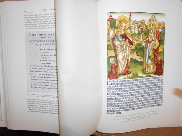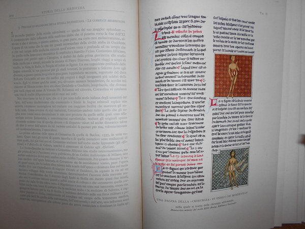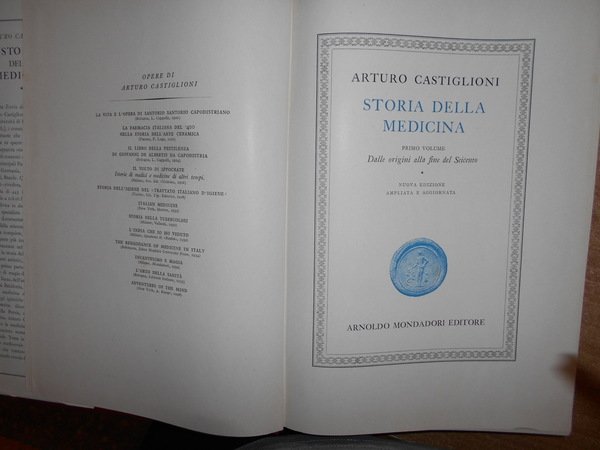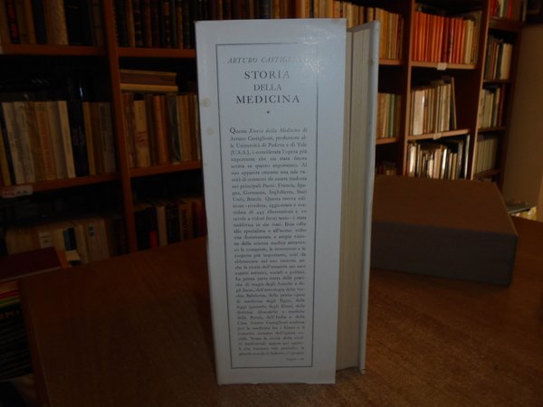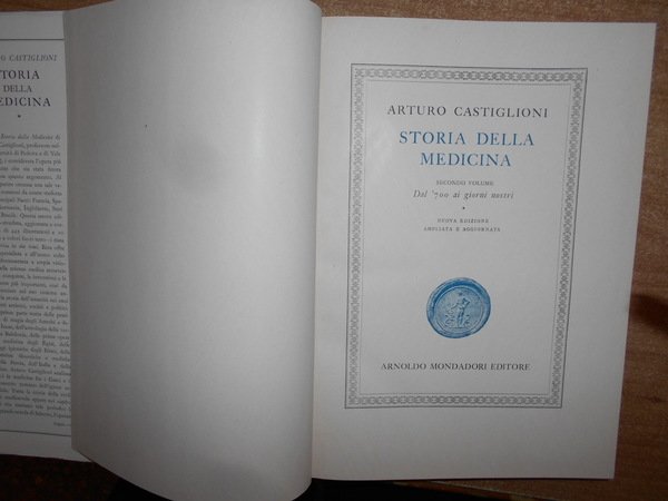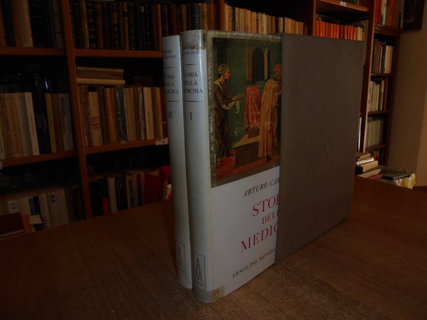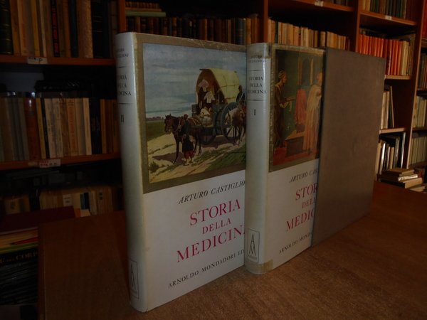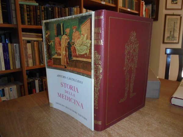 Arturo, Castiglioni. Milano, Arnoldo Mondadori, 1948. Storia della medicina. 2 volumi in-8°, pelle bordeaux con illustrazioni dorate sui piani e titoli con fregi in oro ai dorsi. Complessive xvi, 1002 pp. con 516 illustrazioni n.t. e 10 tavole a colori f.t.con veline protettive. E' la miglior storia della medicina pubblicata in Italia, la sola tradotta anche in inglese. 2 volumi in ottimo stato conservati nel cofanetto in cartone rigido muto con le sovracopertine lievemente usurate. Uff. C - IV - 5
