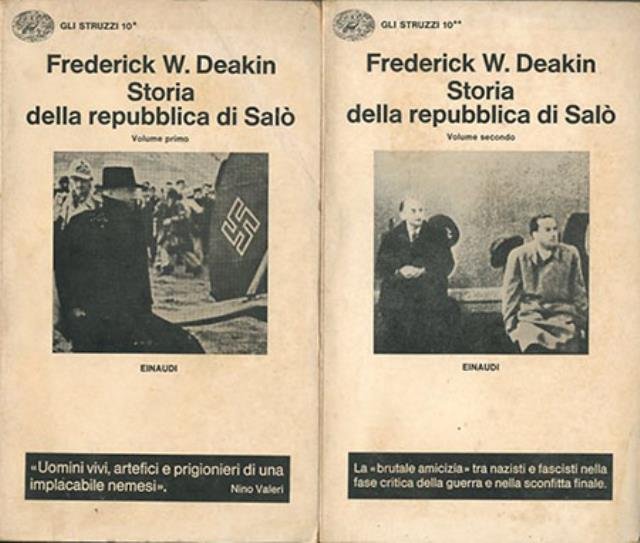 2 v. (XVIII, VI, 1126 p.) ; 20 cm. Gli struzzi, 10*/**. «L'autunno del 1942 segnò per l'Italia una svolta critica nella seconda guerra mondiale. Tutte le prospettive sulle quali si era fondato il suo intervento in guerra due anni prima apparivano ormai distrutte». Una puntuale ricostruzione della fine del fascismo in Italia che, per quanto invecchiata, naturalmente, con il tempo e con l'emergere di altre testimonianze e di nuove ipotesi plausibili, resta tuttavia insuperata proprio per l'evidenza con cui tratta i rapporti tra i dittatori d'Italia e di Germania. Titolo originale dell'opera: «The brutal friendship. Mussolini, Hitler and the fall of italian fascism». Traduzioni di Renzo De Felice, Francesco Golzio e Ornella Francisci. Brossura editoriale, coperta illustrata in b/n in cartoncino flessibile, titolo impresso in nero al piatto e al dorso. Qualche lieve segno del tempo alla coperta e al taglio (ingiallimento e fioriture) per il resto libro integro. Codice libreria 5740.