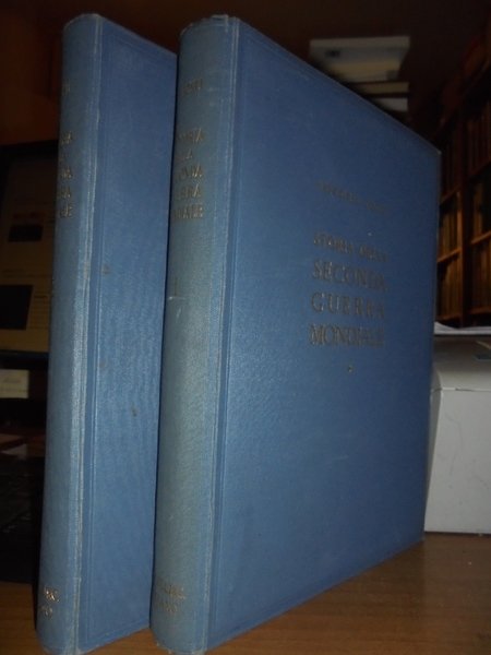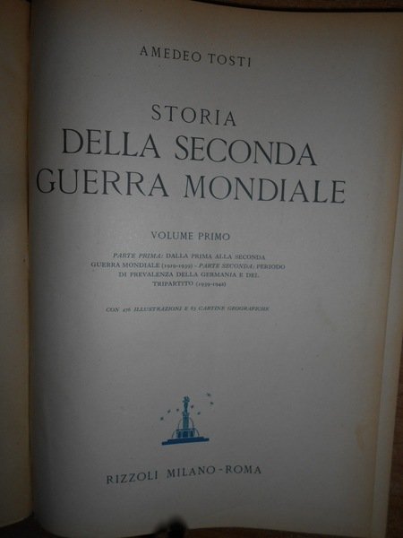 Amedeo, Tosti. Milano - Roma, Rizzoli, 1948. Storia della seconda guerra Mondiale. 2 volumi in-8° grande, tela e oro. 528 pp. con 476 illustrazioni e 85 cartine geografiche.; 516, (1) pp. con 486 illustrazioni e 97 cartine geografiche. In buono stato di conservazione. Primo volume ottimo con normali segni del tempo. Secondo volume con restauri di buona esecuzione nelle prime pagine. Uff. TV. mob. nostro carc.