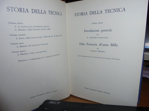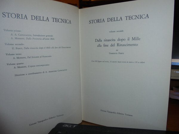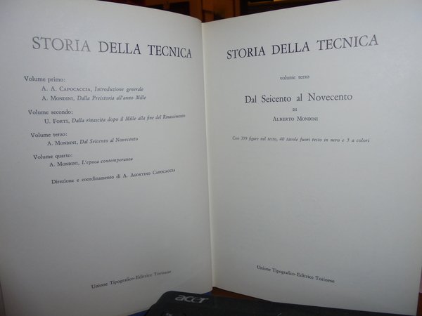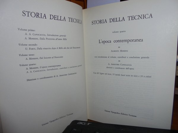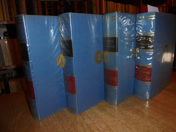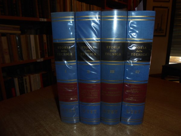 Alberto, Mondini - Uberto, Forti. Torino, Unione Tipografico-Editrice Torinese UTET, 1980. STORIA DELLA TECNICA. 4 volumi in-8°, tela edit. con fregi e titoli in oro ai dorsi, sovracopertine in acetato. Vol. I. Introduzione generale di A. Agostino Capocaccia. Dalla Preistoria all' Anno Mille. xx, 417 pp. con 143 figure nel testo, 36 tavole fuori testo in nero e 10 a colori. Vol. II. Dalla rinascita dopo il Mille alla fine del Risorgimento. xiv, 446 pp. con 109 figure nel testo, 52 tavole fuori testo in nero e 10 a colori. Vol. III. Dal Seicento al Novecento. xiv, 554 pp. con 399 figure nel testo, 40 tavole fuori testo in nero e 5 a colori. Vol. IV. L' Epoca contemporanea. xxvii, 781 pp. con 405 figure nel testo, 55 tavole fuori testo in nero e 10 a colori. Perfettamente conservati. Uff. C - III - 3