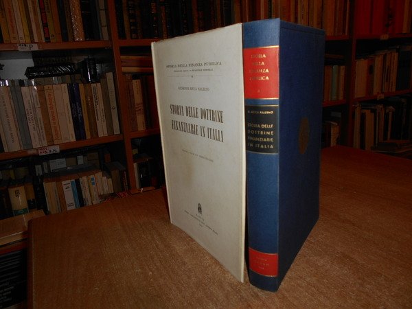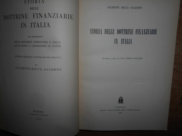 GIUSEPPE RICCA SALERNO. Padova, CEDAM, 1960. STORIA DELLE DOTTRINE FINANZIARIE IN ITALIA. Ristampa a cura del Dott. Sergio Guccione. In-8°, tela bleu con fregi e titolo in oro al dorso con sovracopertina. xxii, 446 pp. Sovracopetina con lievi segni del tempo ma libro in ottimo stato di conservazione. Neg. mob. 6