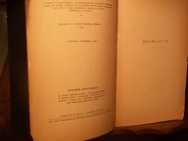 MONDADORI MEDUSA 1947 PRIMA EDIZIONE - EDIZIONE PROVVISORIA - BROSSURA 19 X 12 PP. 121 CONDIZIONI NON BUONE, STRAPPI AL DORSO, PICCOLA MANCANZA AL PIATTO,TAGLI E BORDO PAGINA MOLTO INGIALLITI, PRIMA PAGINA BIANCA IN PARTE STACCATA, PICCOLE MANCANZE ALLE PRIMA PAGINE.
