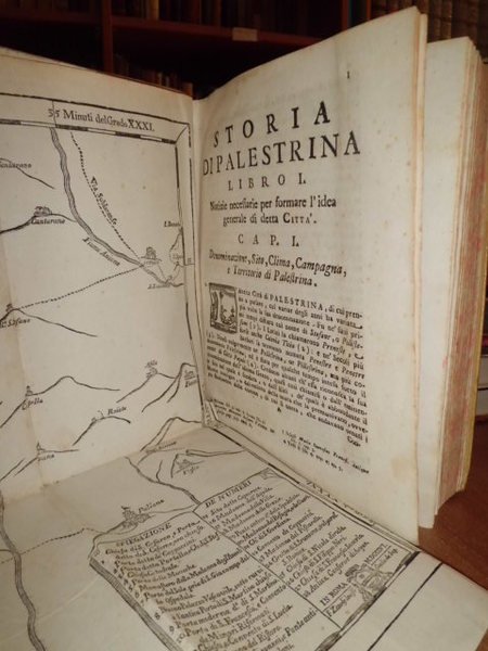 CECCONI, Leonardo - Ascoli, Nicola Ricci, 1756. Storia di Palestrina città del prisco Lazio. Illustrata con antiche iscrizioni e notizie finora inedite. In - 4°, pergamena coeva. xvi, 431, (5) pp. con una grande carta topografica incisa in rame ripiegata più volte f.t. Bellissimo esemplare. Nelle pp. 344 - 45 si trovano note sul famoso musicista Pierluigi da Palestrina. Lozzi, 3331: << Non comune. la carta topografica manca quasi sempre. >>. Bibl. Platneriana, p. 251. Uff. Mob 2