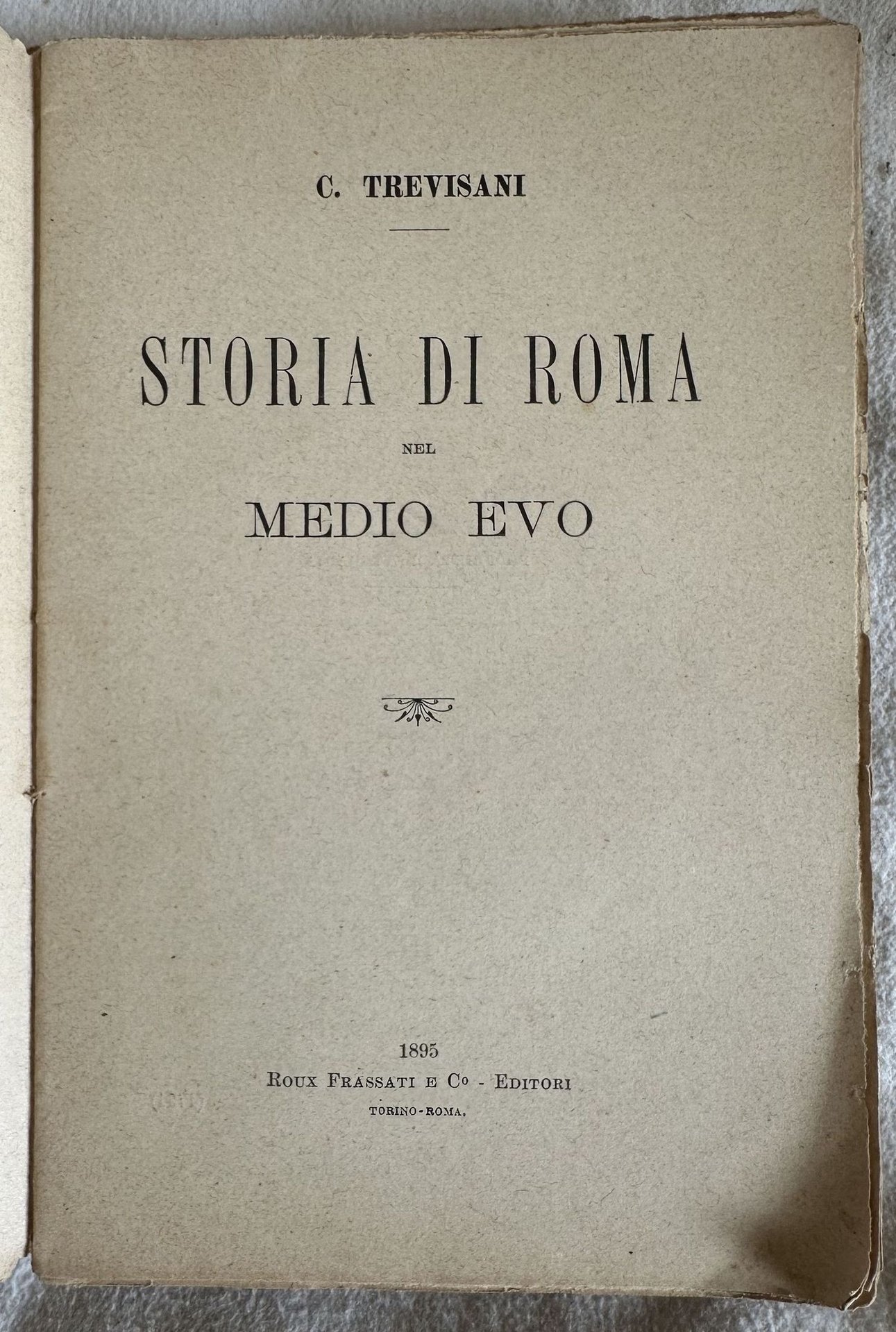 Interessante studio del 1895 su Roma nel Medioevo scritto da Trevisani. All'interno: Roma al tempo dei Goti e dei Longobardi, Roma e i Carolingi, L'età di ferro del papato, Lotta tra il papato e l'Impero, Trionfo del papato dell'impero e sua decadenza, La cattività d'Avignone, I Papi Re ec. In mediocri condizioni Copertina editoriale in mediocri condizioni con usure e mancanze marginali. Piatto anteriore mancante. Legatura quasi assente. Pagine in buone condizioni generali con rare fioriture. In 8. Dim. 19,5x12,5 cm. Pp. XX+389+(3).Interesting study of1895 about Rome in Middleage written by Trevisani. In poor conditions. Editorial cover in poor conditions lightly worn with wearings in the extremities. Front plate lacks. Binding almost lacks. Inside pages are in good conditions with occasional foxing. In 8. Dim. 19,5x12,5 cm. Pp. XX+389+(3).<BR><BR>