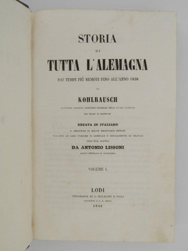 Storia di tutta l'Alemagna dai tempi piu remoti fino all'anno 1838 di Kohlrausch recata in italiano e cresciuta di molte importanti notizie toccanti le cose italiche in generale e specialmente le militari dell'età nostra da Antonio Lissoni