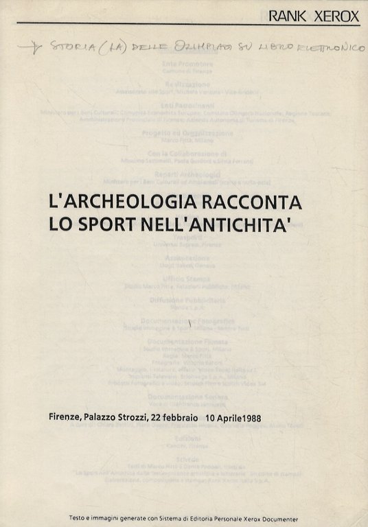 Storia (La) delle Olimpiadi su libro elettronico. (Pubblicato dalla Rank Xerox per la mostra "L'Archeologia racconta lo sport nell'antichità", Firenze, Palazzo Strozzi, 22 febbraio - 10 aprile 1988).
