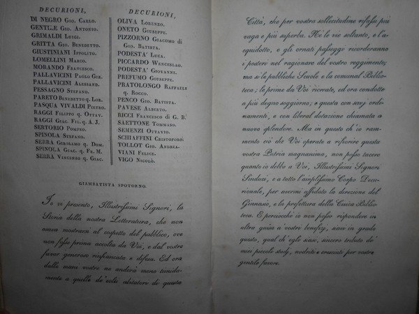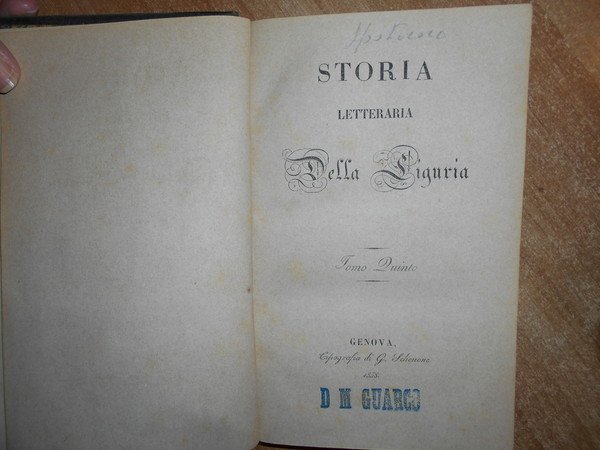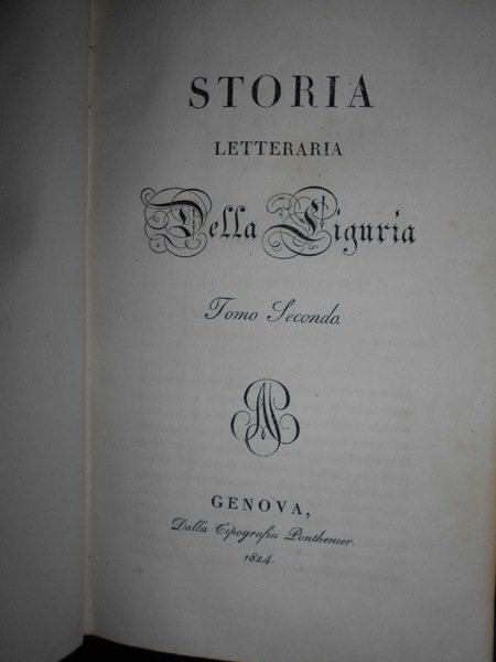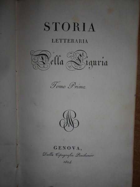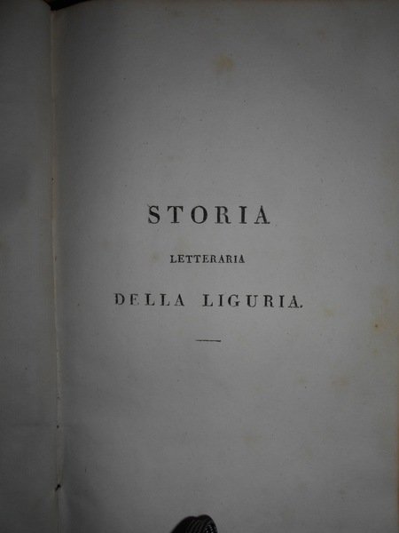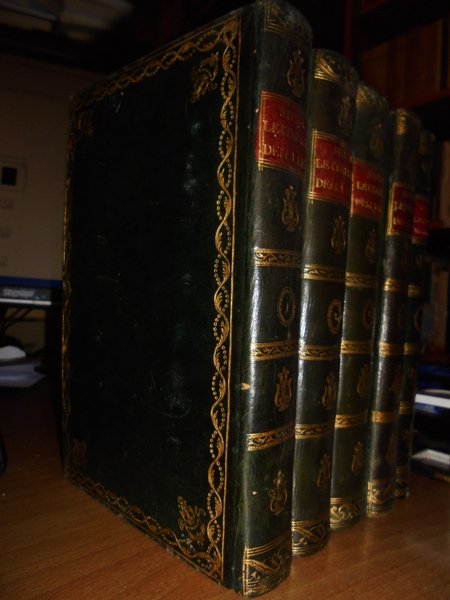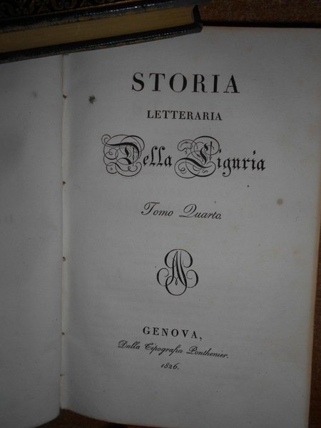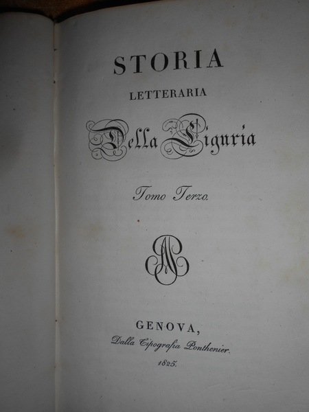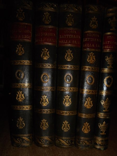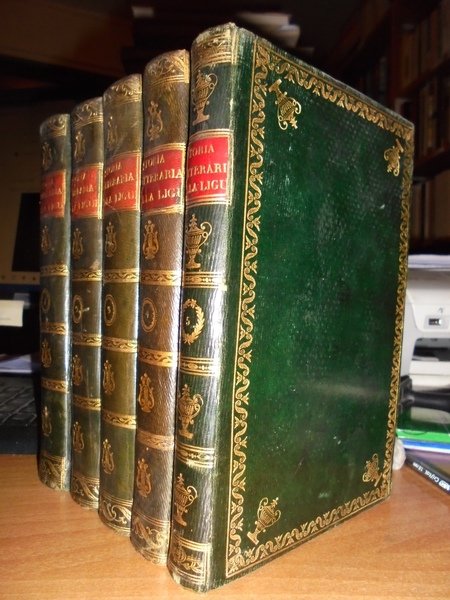 SPOTORNO, GIAMBATTISTA. Genova, Dalla Tipografia Ponthenier, 1824 - 1826. Genova Tipografia di G. Schenone, 1858. Storia letteraria della Liguria. 5 volumi in-8°, bellissima legatura in piena pelle coeva con numerosi fregi in oro su entrambi i piani, e titoli entro tasselli con fregi ai dorsi. (viii), 326 pp.; 335, pp.; pp. (iv), 333-406; (ii), 260 pp.; 312 pp.; xxviii, 236 pp. Bellissimo esemplare completo in edizione originale. Uff. A - I - 1