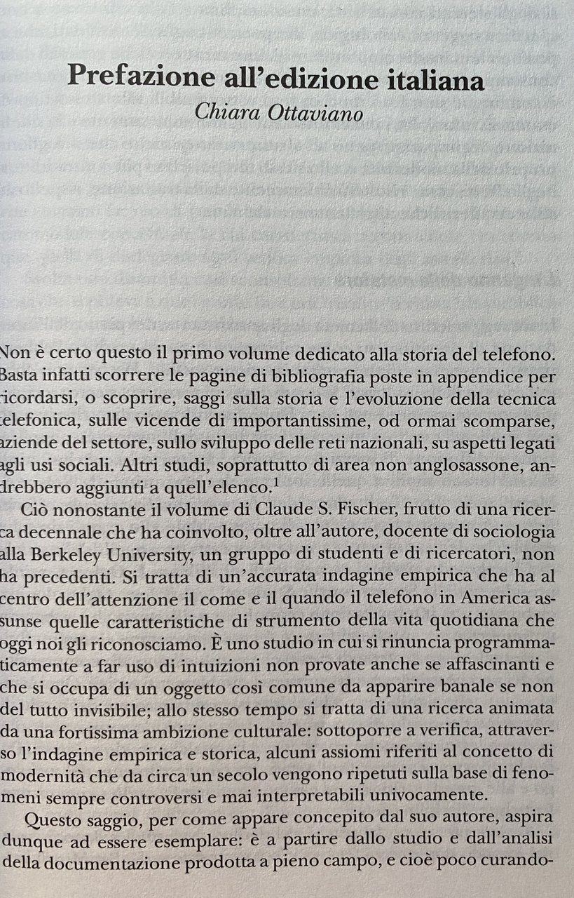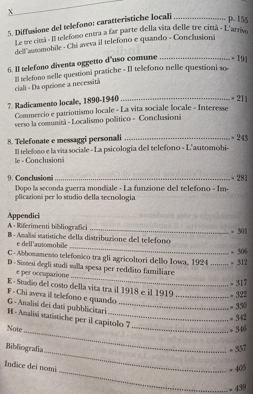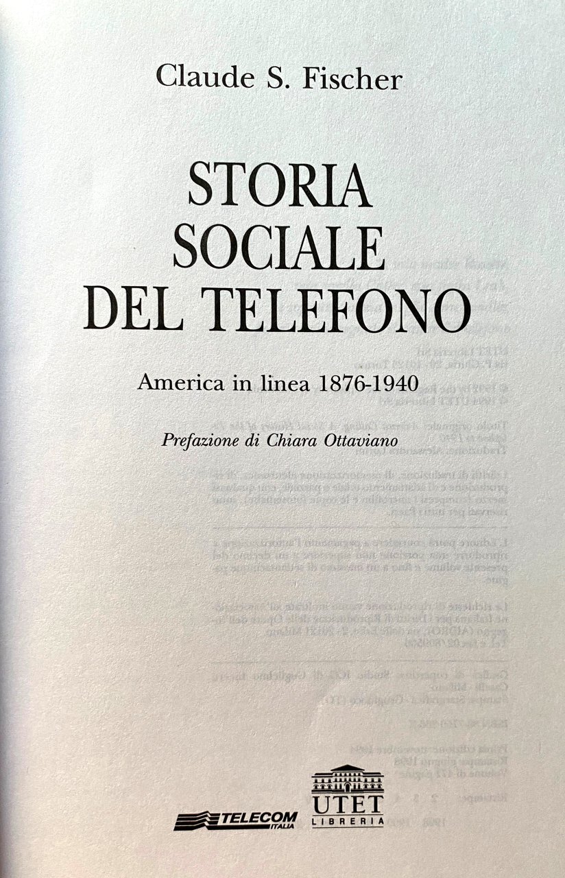 Soggetti: Sociologia delle comunicazioni Comunicazione Storia sociale del telefono Telefoni Apparecchi telefonici Americani Attività Pubblicità per adulti Alexander Graham Bell Antioch Ledger Appendice AT&T Automobile Bell Canada System Colletti blu Operai Censimento Concorrenza Consumatori Conversazioni Costi Cultura Clienti Elettricità Galateo Scambio Famiglie Agricoltori Field Research Corporation Amici storici Città Reddito Intervistati Logit Interurbana Chiamate Parlare Filo Innovazioni tecnologiche moderne Lynd Marin County Middletown Minitel Giornali moderni Palo Alto Linee telefoniche Percentuale Tariffe Abbonamenti Elenchi telefonici PT&T Residenziali Residenti Ruolo Rurale Telefonia Campione San Francisco San Rafael Statistiche Abbonati Centralino Telegrafo Compagnie telefoniche Diffusione Industria Numeri di telefono Servizio telefonico Theodore Vail TPCM U.S. Bureau Utenti Urbani Theodore Vail Colletti bianchi Donne lavoratrici Borghesia Classe media Collezionismo Studi culturali Saggistica Libri rari fuori catalogo Bibliografia Riferimento Segreteria Messaggi Relazioni sociali Vita Comunità Bambini Chiesa Solitudine Noia Vita rurale Voices Revived Mass Media Informazione Pacific Classe operaia Grande Depressione Economia Consumismo Beni Monopolio Società Concorrenza Mercato Europa Reddito Bibliografia Riferimento Collezionismo Indagini Inchieste Dossier Robert Merrill William Ogburn Lynd Trevor Pinch Wiebe Bijker SCOT Hughes Ruth Schwartz Cowan Consumo Telegrafo Fili Italia Poste Telecomunicazioni Telecom SIP Guglielmo Marconi Alfredo Baccarini Concessioni Siemens Halske STET Teti Guglielmo Reiss Romoli IRI Patrice-Alexandre Carré P. Young Bottiglieri Parai Telex Chiamate Magnus Volk Marshall McLuhan Telefonisti Operatori Internazionale Arnold Bennett Cabine telefoniche Gettoni Gutta Percha Ufficio postale Claude Chappe Morse Antonio Meucci Servizio Bisogni Desiderio Georg Simmel Günther Anders Ernst Bloch Walter Benjamin Jürgen Habermas Distanza Intercontinentale Novecento Iowa Numero Appartamenti Buone maniere Innovazioni Modernità Lana Racow Notizie Familiari Telefoni pubblici Monete Eureka California Anni Venti Anni Trenta Anni Quaranta Anni Cinquanta Guerra Sidney Aronson Duplex Spesa Emergenza Benestanti Stati Uniti Lusso Sociology of Communications Social History of the Telephone Telephones American Telephones Activities Adult Advertising Appendix Automobile Blue Collar Census Competition Consumers Conversations Costs Culture Customers Electricity Etiquette Exchange Families Farmers Historic Friends Cities Income Interviewees Long Distance Calls Talking Wire Modern Technological Innovations Newspapers Telephone Lines Percentage Rates Subscriptions Directories Residential Residents Role Rural Telephony Sample Statistics Subscribers Switchboard Telegraph Companies Diffusion Industry Numbers Service Users Urban White Collar Workers Women Bourgeoisie Middle Class Collectibles Cultural Studies Non-Fiction Rare Books Out of Print Bibliography Reference Secretariat Messages Social Relations Life Community Children Church Loneliness Boredom Life Information Working Class Great Depression Economy Consumerism Goods Monopoly Society Competition Market Europe Income Bibliography Reference Collecting Surveys Investigations Consumption Telegraph Wires Italy Post Office Telecommunications Concessions Calls Telephone Operators Operators International Telephone Booths Tokens Post Office Service Needs Desire Distance Intercontinental Twentieth Century Apartments Good Manners Innovations Modernity News Family Car Public Telephones Coins Twenties Thirties Forties Fifties War Spending Emergency Wealthy United States Luxury